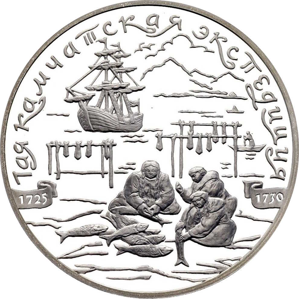 Описание: Зображення корінних жителів Камчатки, які готують рибу, ліворуч і праворуч від них — дати на стрічці «1725» «1730», на задньому плані — вітрильник, праворуч — рибалка в човні, на горизонті — обриси гір, хмари. Напис по краю — «1ая КАМЧАТСКАЯ ЭКСПЕДИЦИЯ» (1-а Камчатська експедиція).