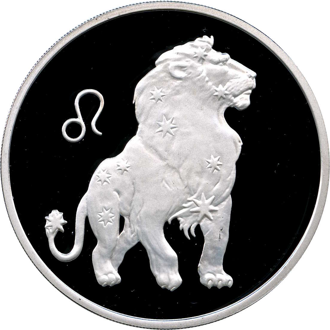 Описание: Зображення лева на тлі зірок, ліворуч — знак зодіакального сузір'я Лева.