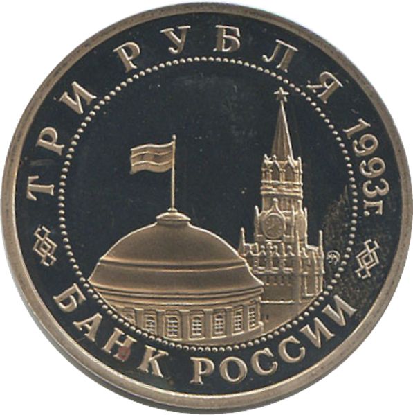 Описание: У центрі — вид на купол будівлі Сенату та Спаську вежу Московського Кремля, праворуч — знак монетного двору. Написи по краю обрамлені колом з крапок: зверху — «ТРИ РУБЛЯ 1993 г.» (ТРИ РУБЛІ 1993), знизу — «БАНК РОССИИ» (БАНК РОСІЇ).