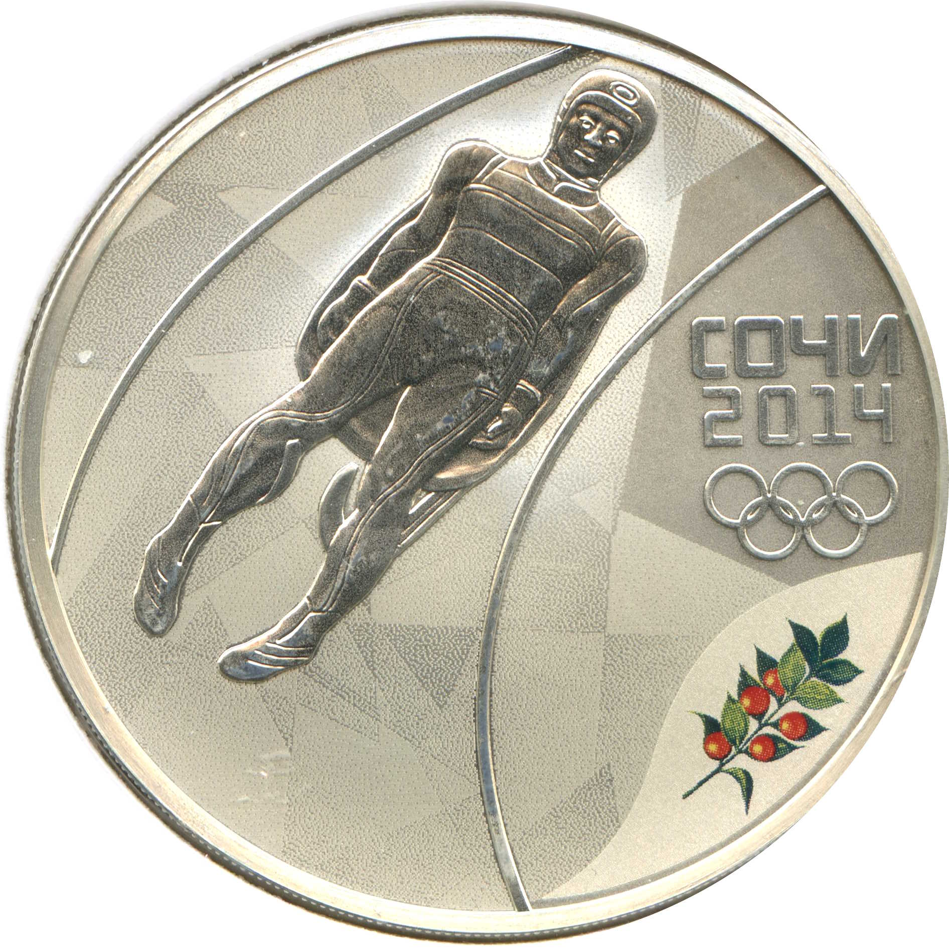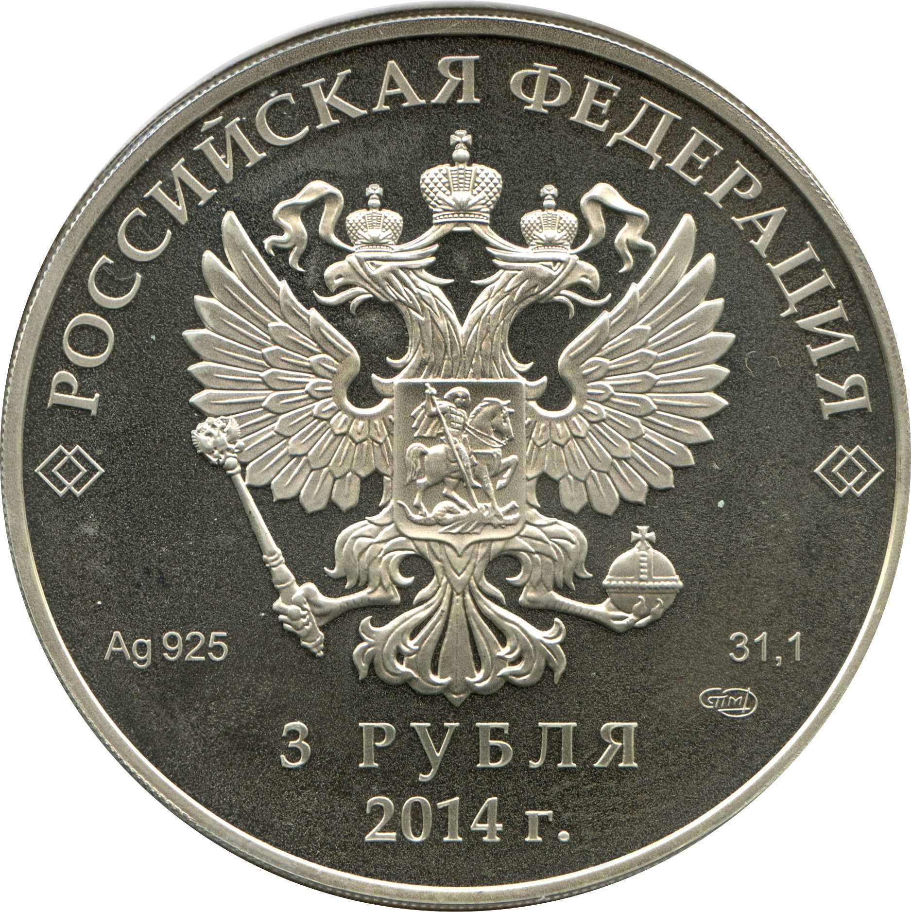 Описание: На дзеркальному полі диска — рельєфне зображення Державного герба Російської Федерації, над ним — напівкругла напис по колу: «РОССИЙСКАЯ ФЕДЕРАЦИЯ» (РОСІЙСЬКА ФЕДЕРАЦІЯ), нижче під гербом: ліворуч — позначення металу за періодичною системою елементів Д.І. Менделєєва та його чистота, праворуч у два рядки — позначення вмісту дорогоцінного металу та знак монетного двору, внизу по центру у два рядки — номінал монети: «3 РУБЛЯ» (3 РУБЛІ) і дата: «2014 г.» (2014).