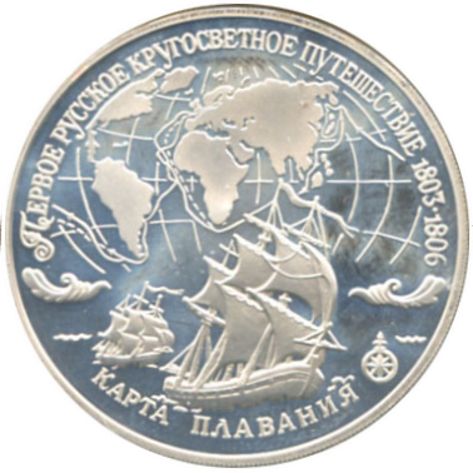 Описание: Зображення кораблів «Надія» та «Нева» над картою навколосвітньої подорожі. Написи по краю: зверху — «ПЕРША РОСІЙСЬКА НАВКОЛОСВІТНЯ ПОДОРОЖ 1803-1806», знизу — «КАРТА МАРШРУТУ».