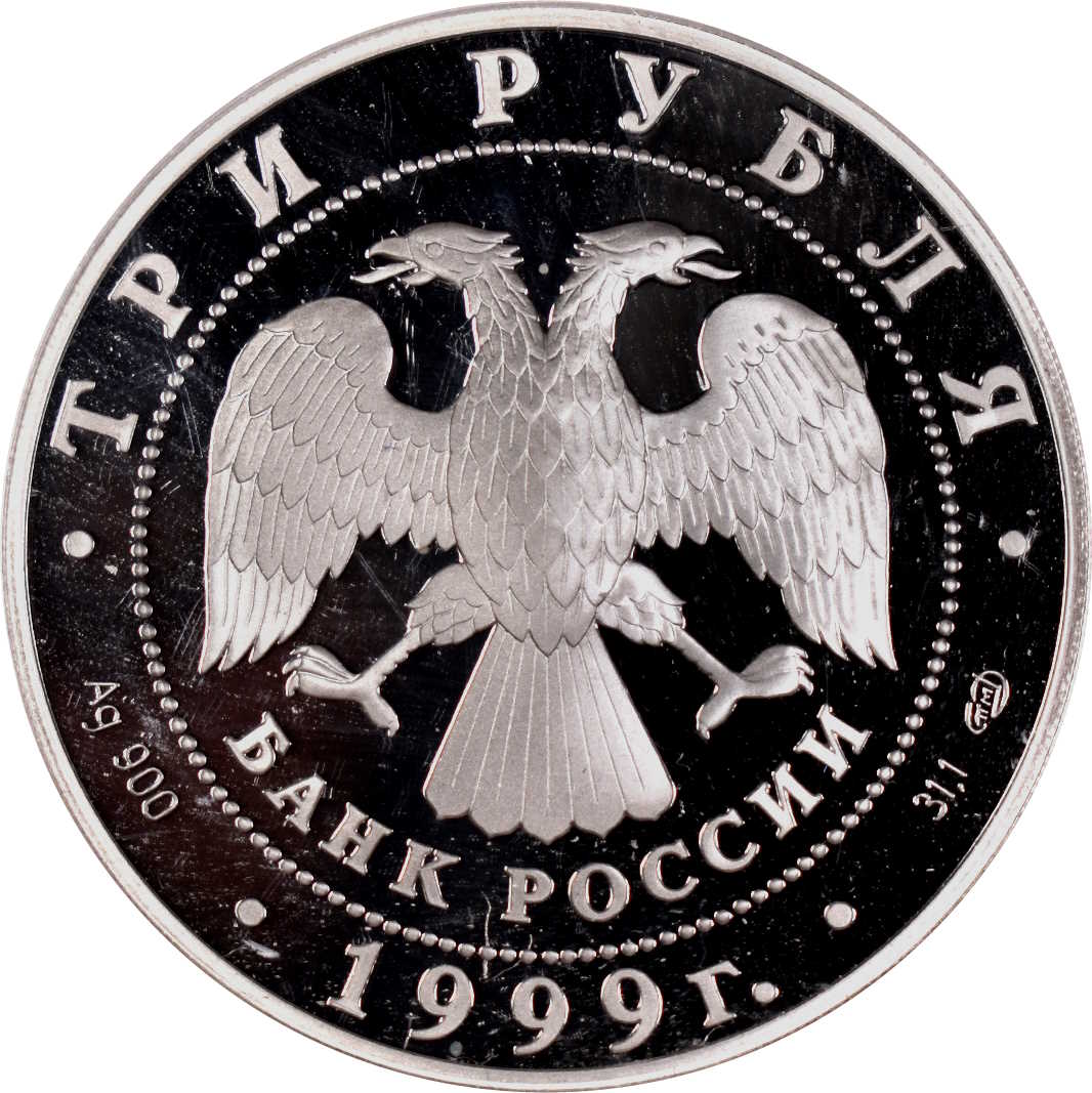 Описание: У центрі — емблема Банку Росії (двоголовий орел, створений І. Білібіним), нижче — напівкруглий напис — «БАНК РОССИИ» (БАНК РОСІЇ), обрамлена колом з крапок, а по краю — написи: зверху — «ТРИ РУБЛЯ» (ТРИ РУБЛІ), знизу — «1999», літери ліворуч позначають метал і пробу, праворуч — вміст дорогоцінного металу та знак монетного двору.