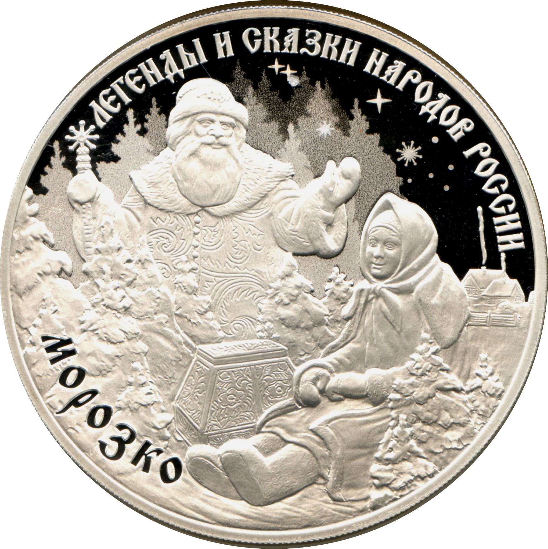Описание: На дзеркальній поверхні диска зображено рельєфну сцену з казки «Морозко» на тлі стилізованих зображень лісу, зірок і сніжинок; по краю розміщено написи: «ЛЕГЕНДЫ И СКАЗКИ НАРОДОВ РОССИИ» (ЛЕГЕНДИ ТА КАЗКИ НАРОДІВ РОСІЇ) у верхній частині та «МОРОЗКО» (МОРОЗКО) у нижній лівій частині.