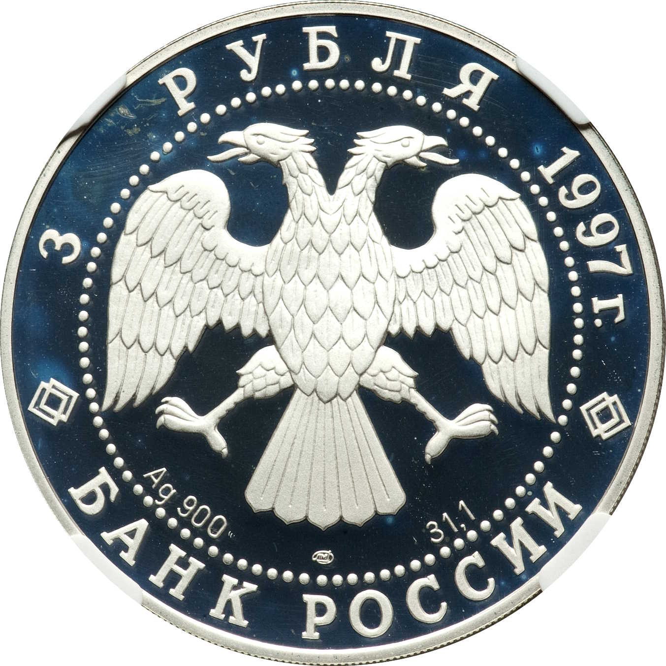 Описание: Двоголовий орел, створений художником І. Білібіним. Написи по краю: зверху — «3 РУБЛЯ 1997 г.» (3 РУБЛЯ 1997), знизу — «БАНК РОССИИ» (БАНК РОСІЇ). Літери нижче позначають метал, пробу, вміст дорогоцінного металу та знак монетного двору.