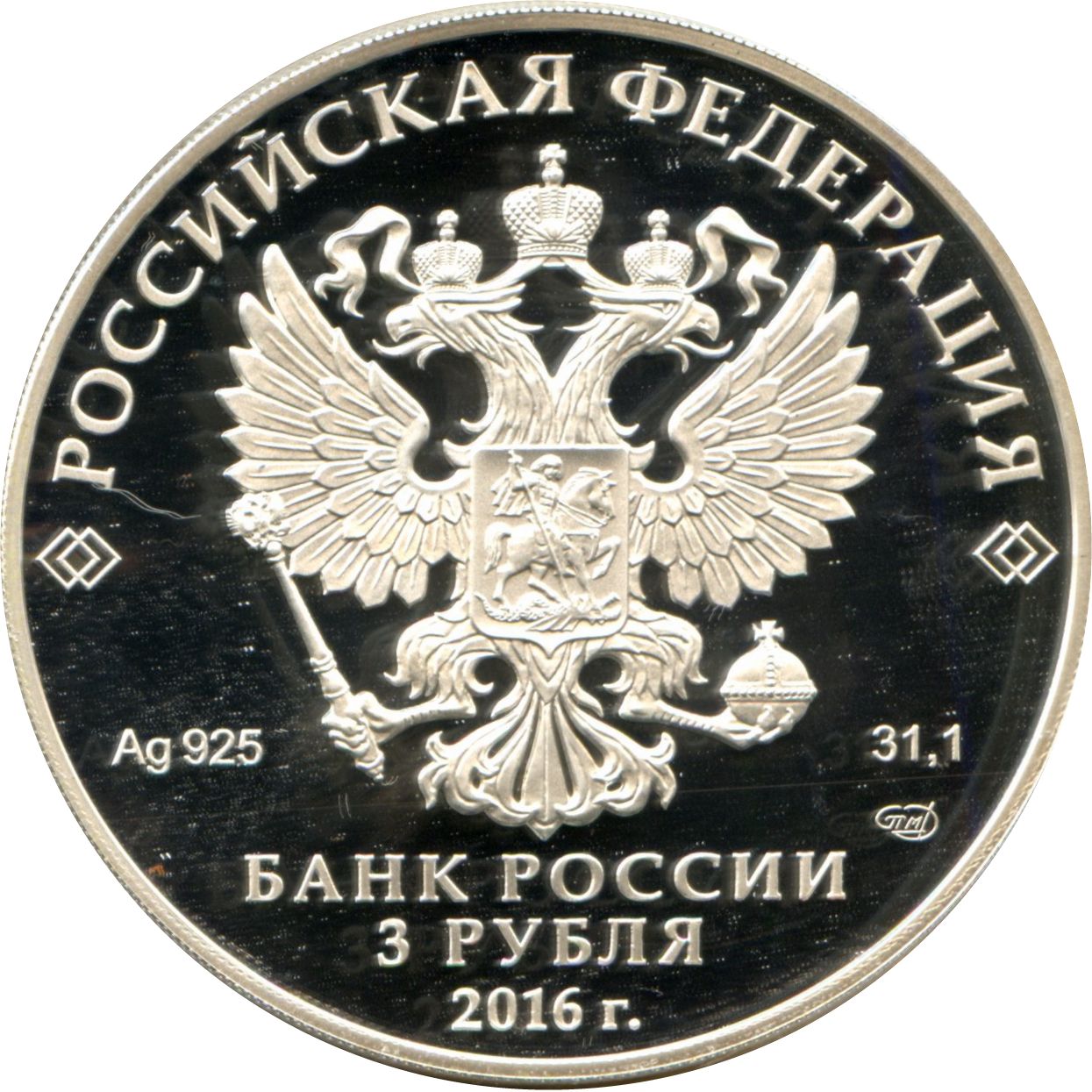 Описание: На дзеркальному полі диска – рельєфне зображення Державного герба Російської Федерації, над ним – напівкругла напис по колу: «РОССИЙСКАЯ ФЕДЕРАЦИЯ» (РОСІЙСЬКА ФЕДЕРАЦІЯ), обрамлене з обох боків подвійними ромбами, нижче під гербом: ліворуч – позначення дорогоцінного металу та його проби, праворуч – вміст дорогоцінного металу та торговельна марка монетного двору, внизу по центру, у три рядки – напис: «БАНК РОССИИ» (БАНК РОСІЇ), номінал монети: «3 РУБЛЯ» (3 РУБЛІ), рік випуску: «2016 г.» (2016).