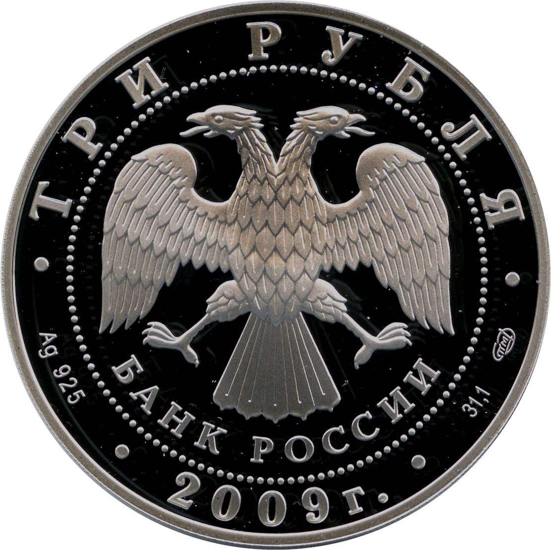 Описание: У центрі — емблема Банку Росії [двоголовий орел із розпростертими крилами, під ним — напівкруглий напис «БАНК РОССИИ» (БАНК РОСІЇ)], обрамлена колом з крапок і написів по краю — зверху: «ТРИ РУБЛЯ», нижче: ліворуч - позначення дорогоцінного металу та його проби, у центрі - рік випуску «2009 г.», праворуч - вміст дорогоцінного металу та знак монетного двору.