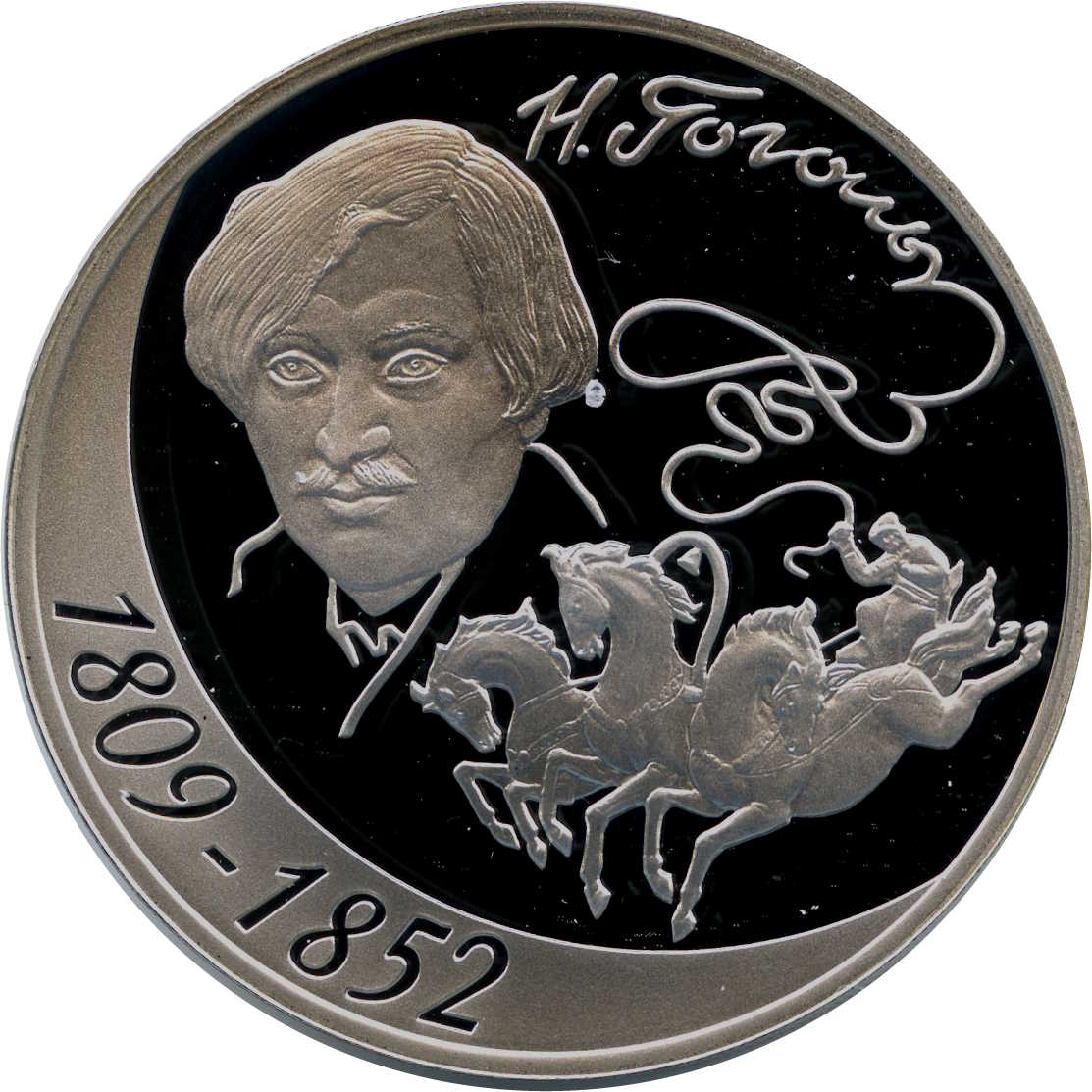 Описание: На гладкому полі ліворуч — портрет М. В. Гоголя (робота А. А. Іванова, 1841 р.), праворуч зверху — факсимільний напис письменника: «Н. ГОГОЛЬ», що переходить у стилізоване зображення батога, піднятого кучером над стрімко мчащою трійкою (три коні, запряжені в ряд), нижче на матовій поверхні у формі півночі — дати: «1809-1852».