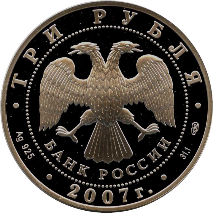 Описание: У центрі — емблема Банку Росії [двоголовий орел зі спущеними крилами, під ним — напівкруглий напис «БАНК РОССИИ» (БАНК РОСІЇ)], обрамлена колом з крапок і написів по краю — зверху: «ТРИ РУБЛЯ» (ТРИ РУБЛІ), знизу: ліворуч – позначення дорогоцінного металу та його проби, у центрі – рік випуску «2007 г.» (2007), праворуч – вміст дорогоцінного металу та знак монетного двору.
