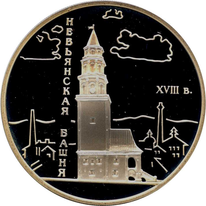 Описание: У центрі — вежа, ліворуч від неї — вертикальний напис «НЕВЬЯНСКАЯ БАШНЯ» (НЕВЯНСЬКА ВЕЖА), праворуч — дата «XVIII в.» (XVIII століття), на задньому плані — обриси міста на тлі пагорбів.