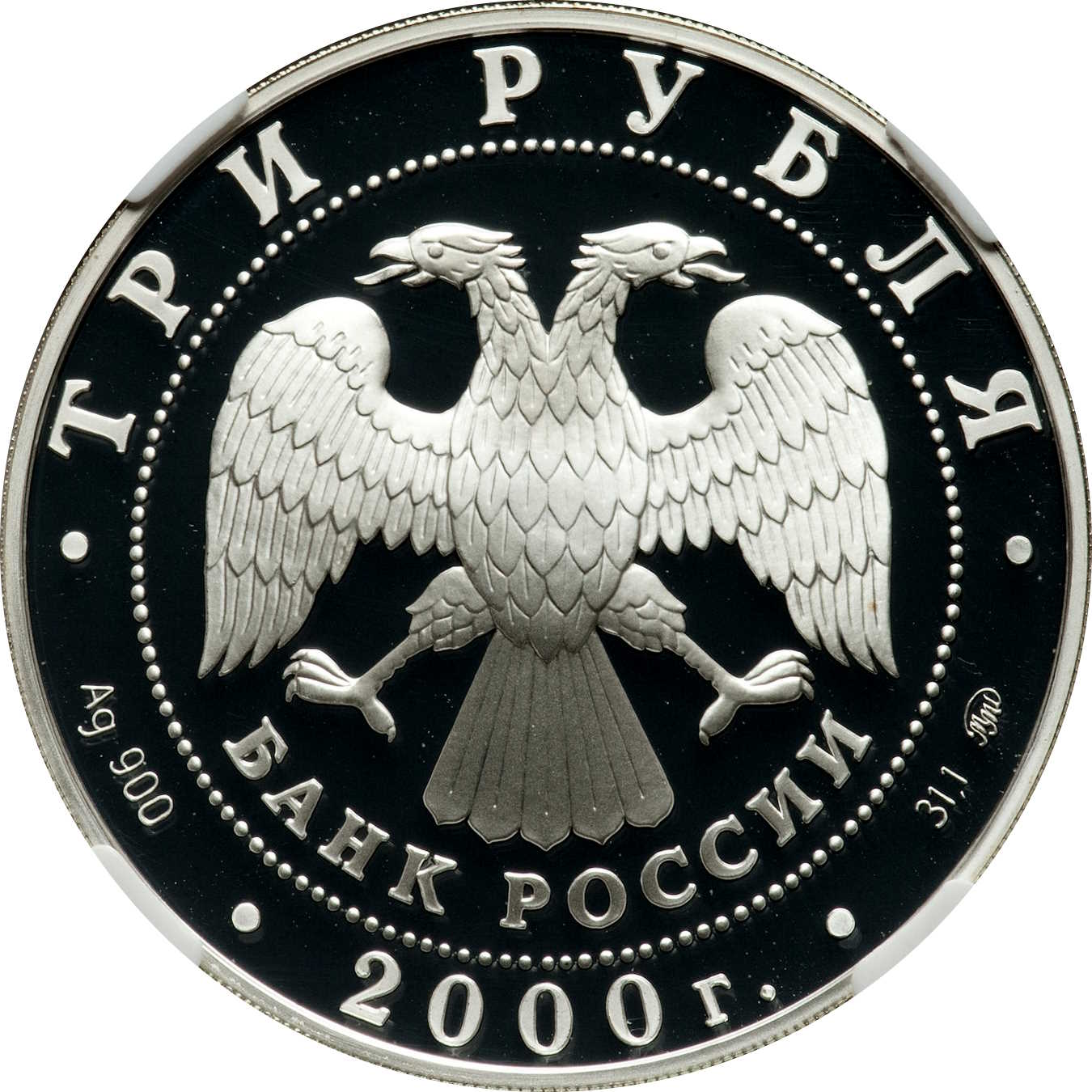 Описание: У центрі — емблема Банку Росії (двоголовий орел, створений І. Білібіним), нижче — напівкруглий напис «БАНК РОССИИ» (БАНК РОСІЇ), обрамлений колом з крапок і написів по краю: вгорі — «ТРИ РУБЛЯ» (ТРИ РУБЛІ), внизу — дата «2000», літери ліворуч позначають метал і пробу, праворуч — вміст дорогоцінного металу і знак монетного двору.