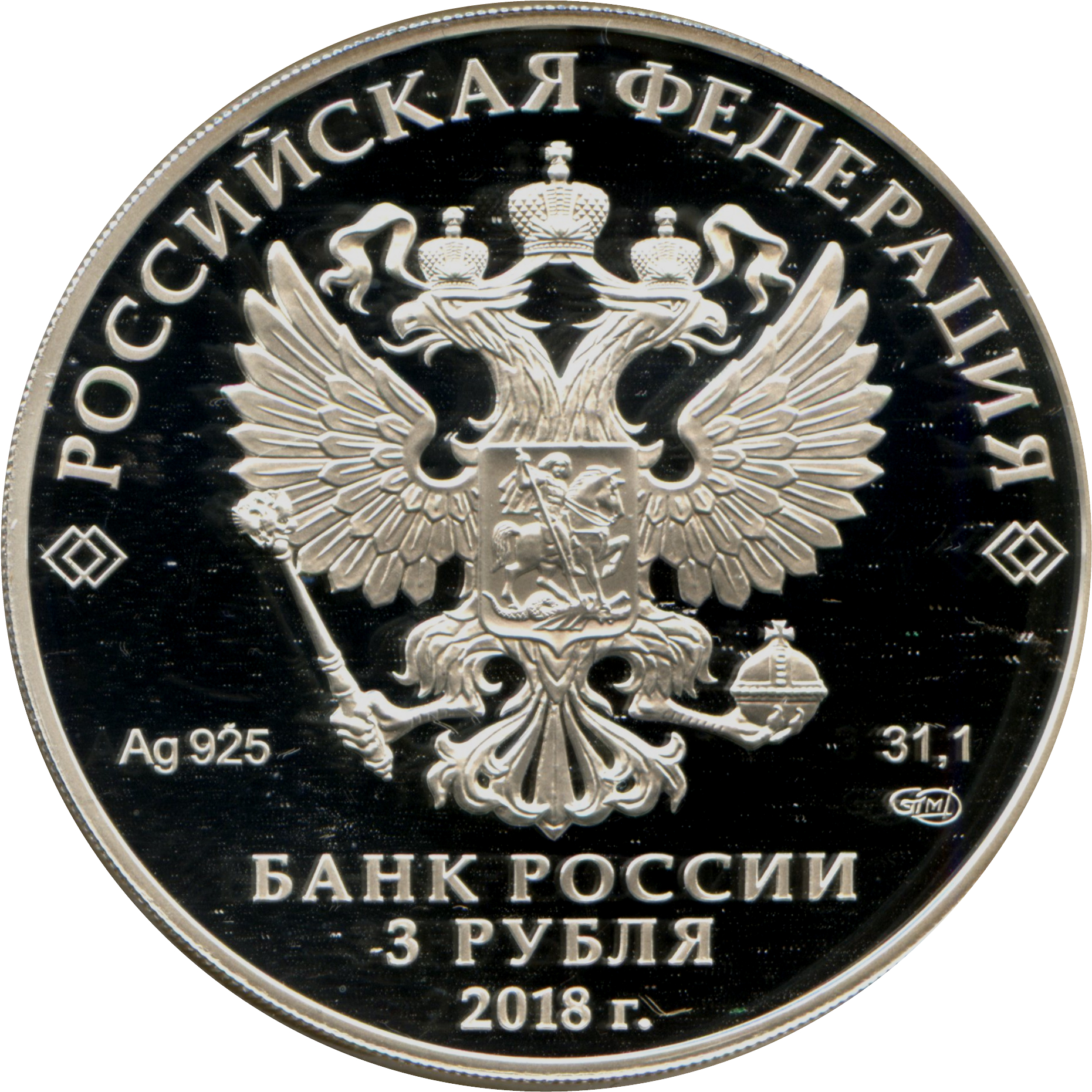 Описание: На дзеркальному полі диска — рельєфне зображення Державного герба Російської Федерації, над ним по колу — напівкруглий напис «РОССИЙСКАЯ ФЕДЕРАЦИЯ» (РОСІЙСЬКА ФЕДЕРАЦІЯ), обрамлений з обох боків подвійними ромбами, нижче під гербом ліворуч вказівки на дорогоцінний метал і його пробу, праворуч — вміст дорогоцінного металу і знак монетного двору, внизу по центру в три рядки напис «БАНК РОССИИ» (БАНК РОСІЇ), номінал монети «3 РУБЛЯ» (3 РУБЛІ), рік випуску «2018 г.» (2018).