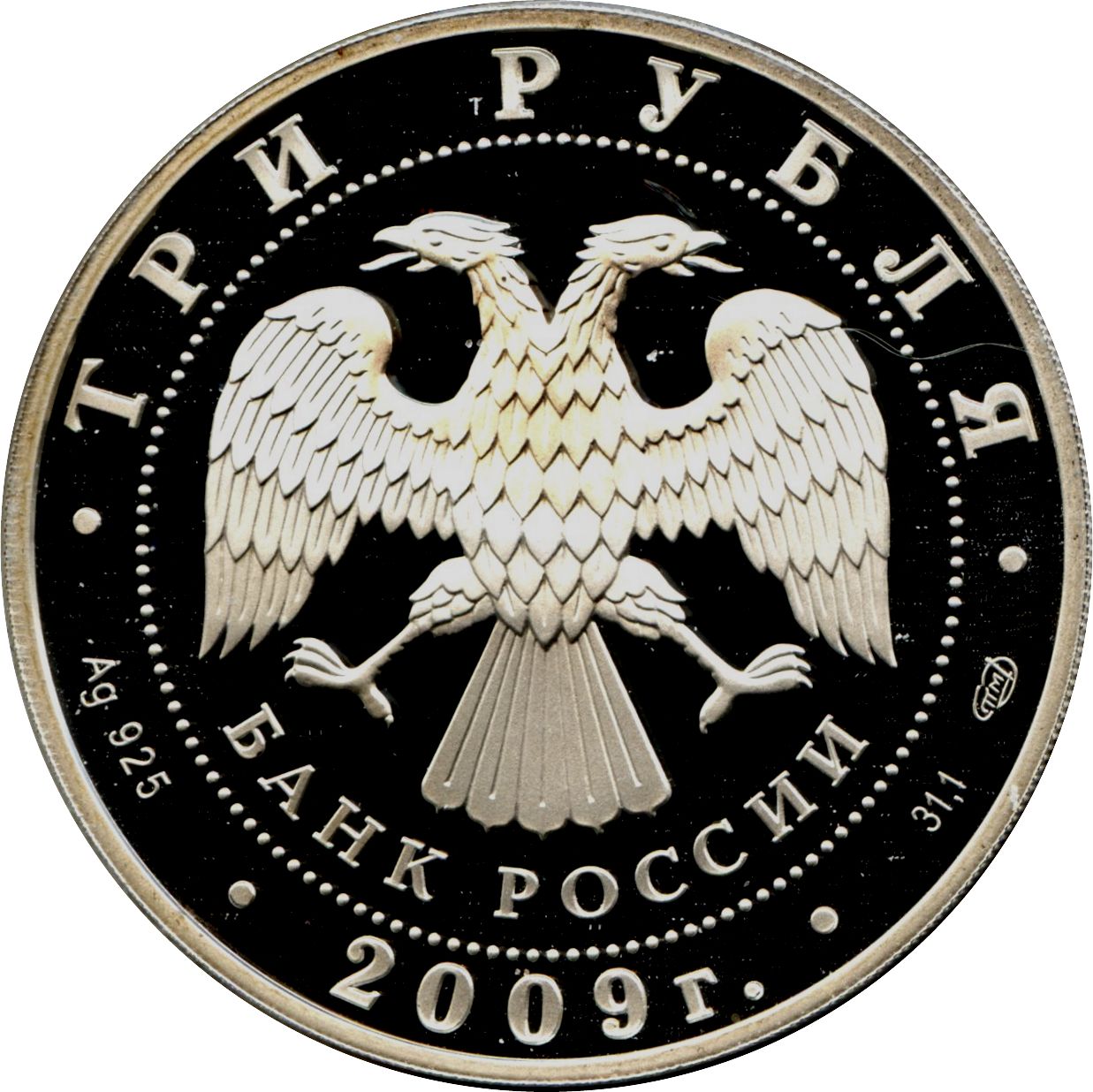 Описание: У центрі — емблема Банку Росії [двоголовий орел із опущеними крилами, під ним — напівкруглий напис «БАНК РОССИИ» (БАНК РОСІЇ)], обрамлена колом з крапок і написів по краю — зверху: «ТРИ РУБЛЯ», нижче: ліворуч - позначення дорогоцінного металу та його проби, у центрі - рік випуску «2009 г.», праворуч - вміст дорогоцінного металу та знак монетного двору.