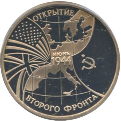 Описание: На тлі карти Європи — стилізовані національні прапори, ліворуч — Великої Британії та США, праворуч — Радянського Союзу, написи вздовж краю: зверху — «ОТКРЫТИЕ» (ВІДКРИТТЯ), знизу — «ВТОРОГО ФРОНТА» (ДРУГОГО ФРОНТУ), в центрі дата у два рядки — «ИЮНЬ 1944» (ЧЕРВЕНЬ 1944) (початок військових дій на другому фронті).