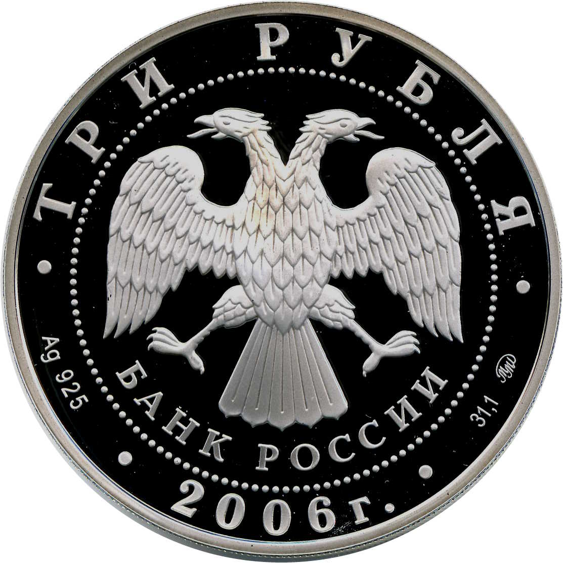Описание: У центрі — емблема Банку Росії [двоголовий орел із опущеними крилами, нижче — напівкруглий напис — «БАНК РОССИИ» (БАНК РОСІЇ)], обрамлений колом з крапок і написами по краю: вгорі – «ТРИ РУБЛЯ» (ТРИ РУБЛІ), внизу – рік випуску «2006», літери ліворуч позначають метал і пробу, праворуч – вміст дорогоцінного металу і знак монетного двору.