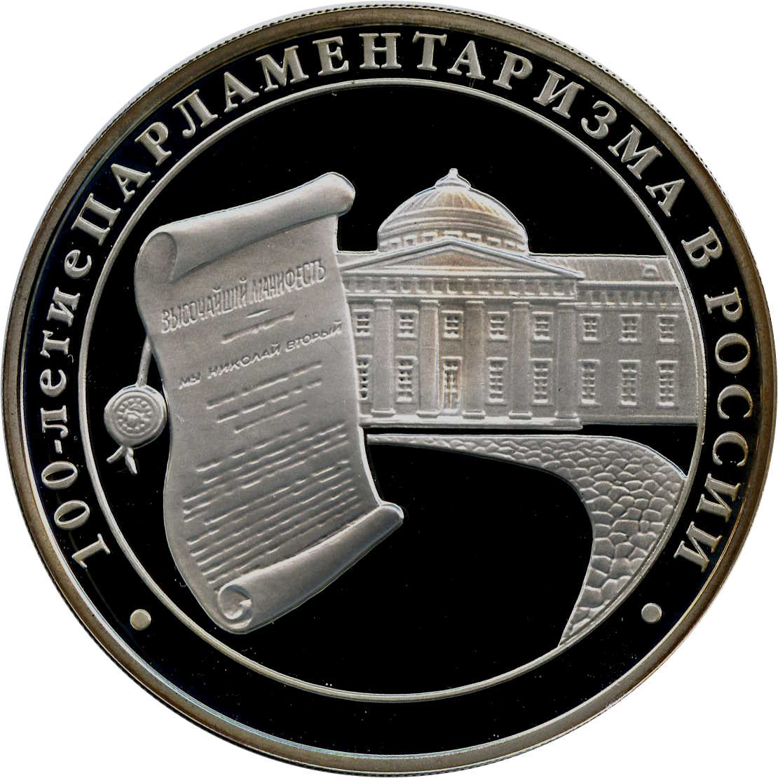 Описание: Зліва — сувій із Верховним маніфестом російського імператора Миколи II, у центрі — будівля Таврійського палацу в Санкт-Петербурзі. Напис по краю — «100-ЛЕТИЕ ПАРЛАМЕНТАРИЗМА В РОССИИ» (СТОРІЧЧЯ ПАРЛАМЕНТАРИЗМУ В РОСІЇ).