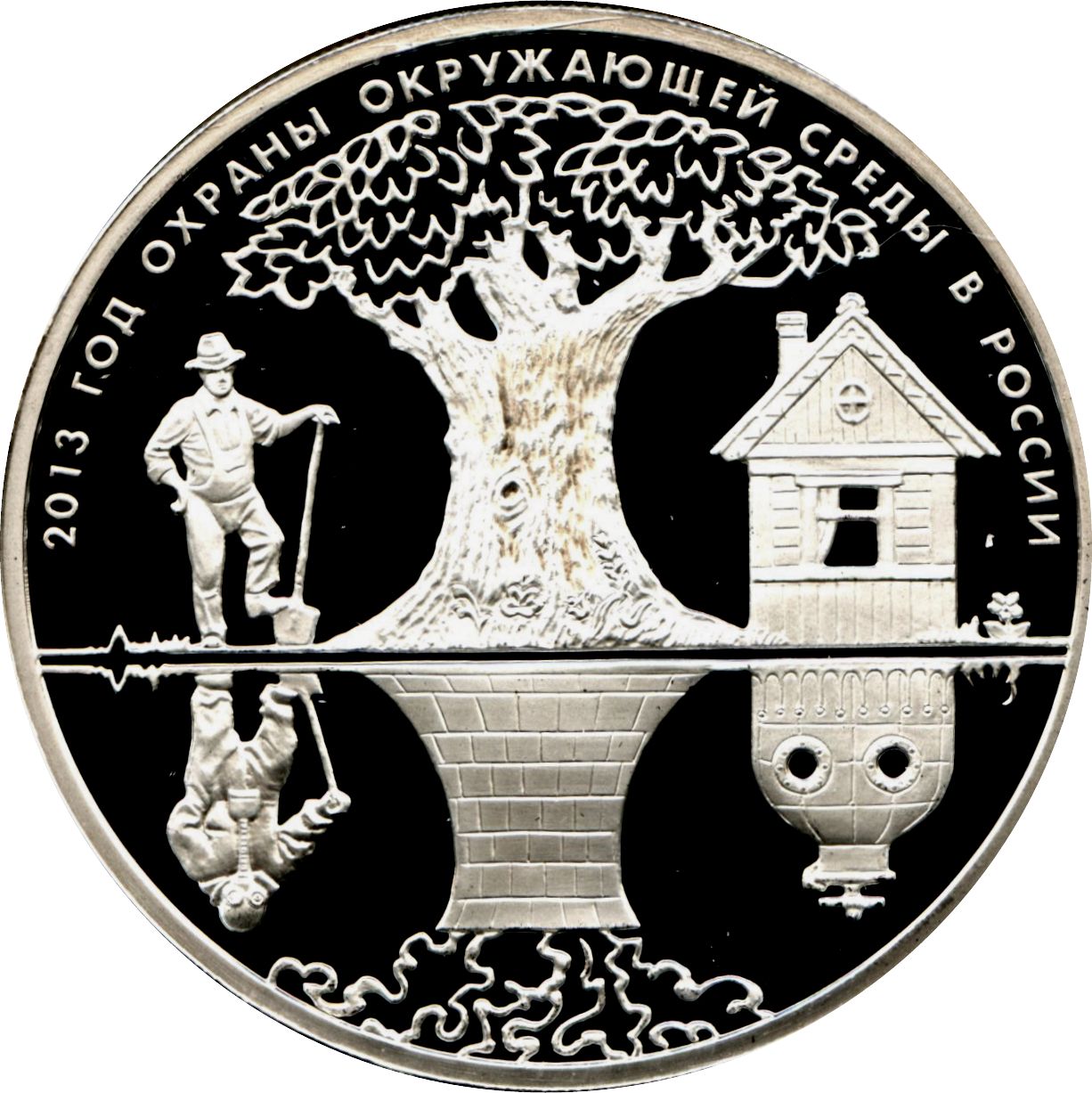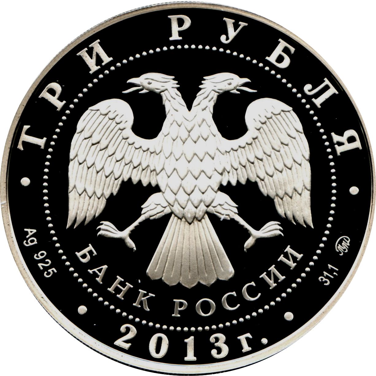 Описание: У центрі — емблема Банку Росії [двоголовий орел із опущеними крилами, під ним — напівкруглий напис «БАНК РОССИИ» (БАНК РОСІЇ)], обрамлена колом з крапок і написів по краю — зверху: «ТРИ РУБЛЯ», нижче: ліворуч - позначення дорогоцінного металу та його проби, у центрі - рік випуску, праворуч - вміст дорогоцінного металу та знак монетного двору.