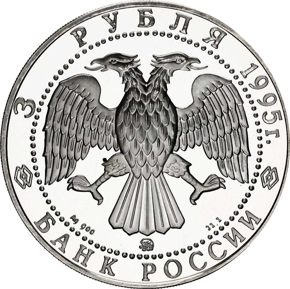 Описание: У центрі — емблема Банку Росії (двоголовий орел, розроблений І. Білібіним), під нею літери, що позначають метал, пробу, знак монетного двору та вміст дорогоцінного металу. Написи по краю, обрамлені колом з крапок: зверху — «3 РУБЛЯ 1995 г.» (3 РУБЛЯ 1995), знизу — «БАНК РОССИИ» (БАНК РОСІЇ).