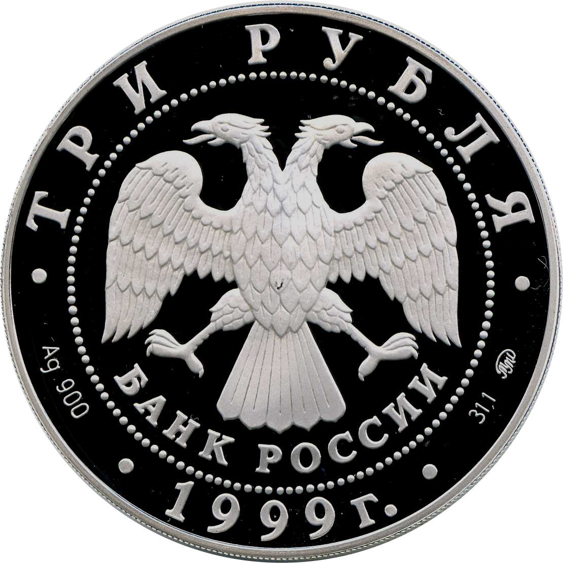 Описание: У центрі — емблема Банку Росії (двоголовий орел, створений І. Білібіним), нижче — напівкруглий напис — «БАНК РОССИИ» (БАНК РОСІЇ), обрамлена колом з крапок, а по краю — написи: вгорі — «ТРИ РУБЛЯ», внизу — «1999», літери ліворуч позначають метал і пробу, праворуч — вміст дорогоцінного металу та знак монетного двору.