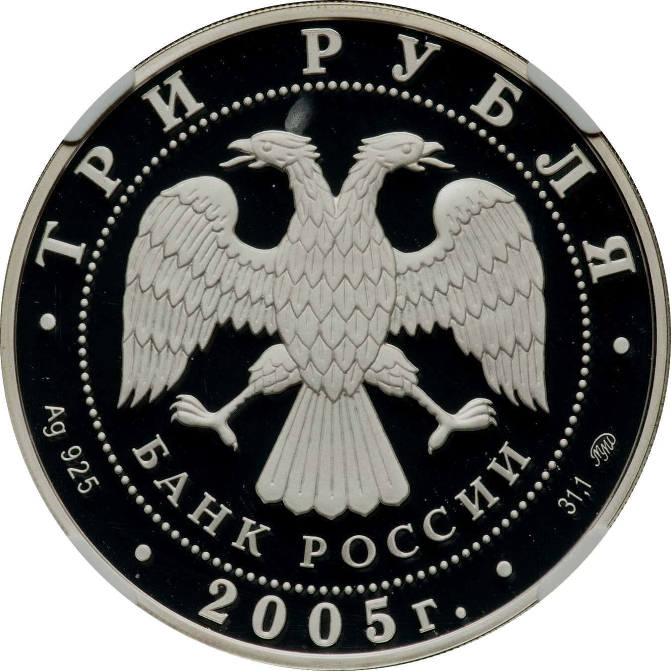 Описание: У центрі — емблема Банку Росії [двоголовий орел із опущеними крилами, нижче — напівкруглий напис — «БАНК РОССИИ» (БАНК РОСІЇ)], обрамлений колом з крапок і написами по краю: вгорі – «ТРИ РУБЛЯ» (ТРИ РУБЛІ), внизу – рік випуску «2005», літери ліворуч позначають метал і пробу, праворуч – вміст дорогоцінного металу і знак монетного двору.
