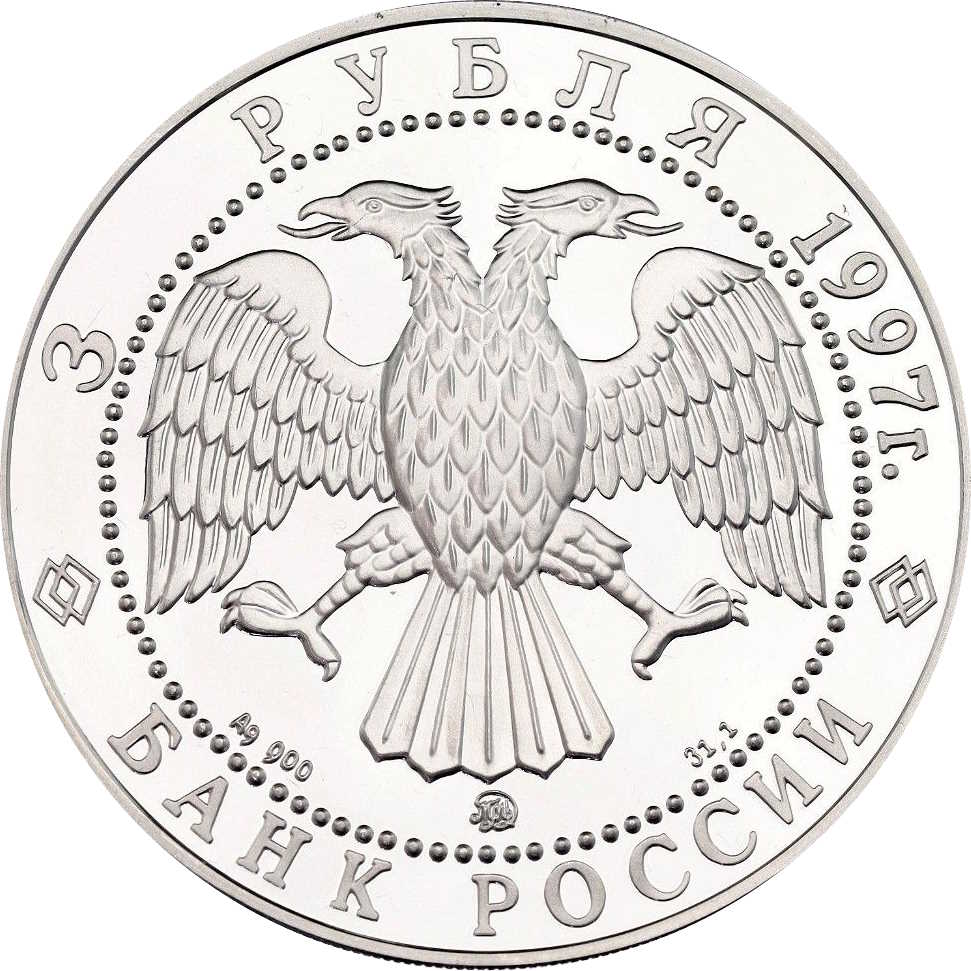 Описание: Двоголовий орел, створений художником І. Білібіним. Написи по краю: зверху — «3 РУБЛЯ 1997 г.» (3 РУБЛЯ 1997), знизу — «БАНК РОССИИ» (БАНК РОСІЇ). Літери нижче позначають метал, пробу, вміст дорогоцінного металу та знак монетного двору.