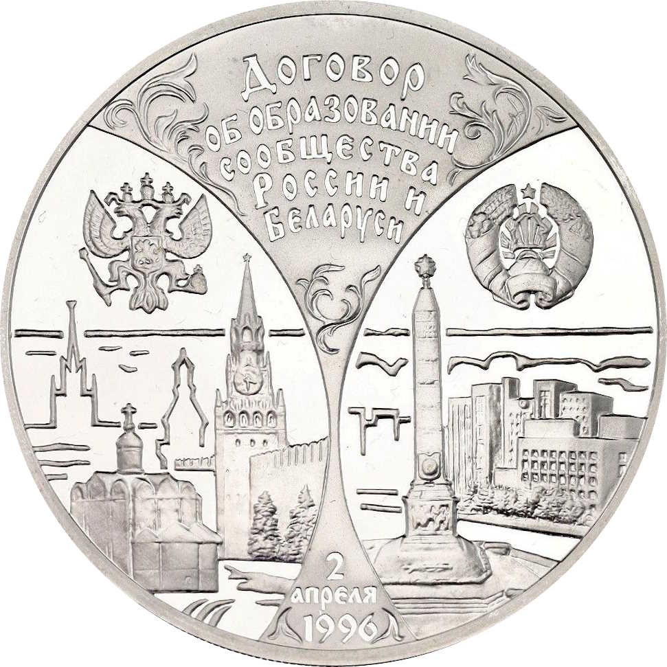 Описание: У верхній частині ліворуч і праворуч — державні герби Росії та Білорусі. Напис у верхній частині посередині у п'яти рядках: «ДОГОВОР ОБ ОБРАЗОВАНИИ СООБЩЕСТВА РОССИИ И БЕЛАРУСИ» (ДОГОВІР ПРО УТВОРЕННЯ СПІЛЬНОТИ РОСІЇ ТА БІЛОРУСІ), нижче ліворуч — вид Москви з Кремлем, праворуч — вид Мінська з обеліском на площі Перемоги та Будинком білоруського уряду. Внизу – дата підписання Договору «2 АПРЕЛЯ 1996» (2 КВІТНЯ 1996 РОКУ).