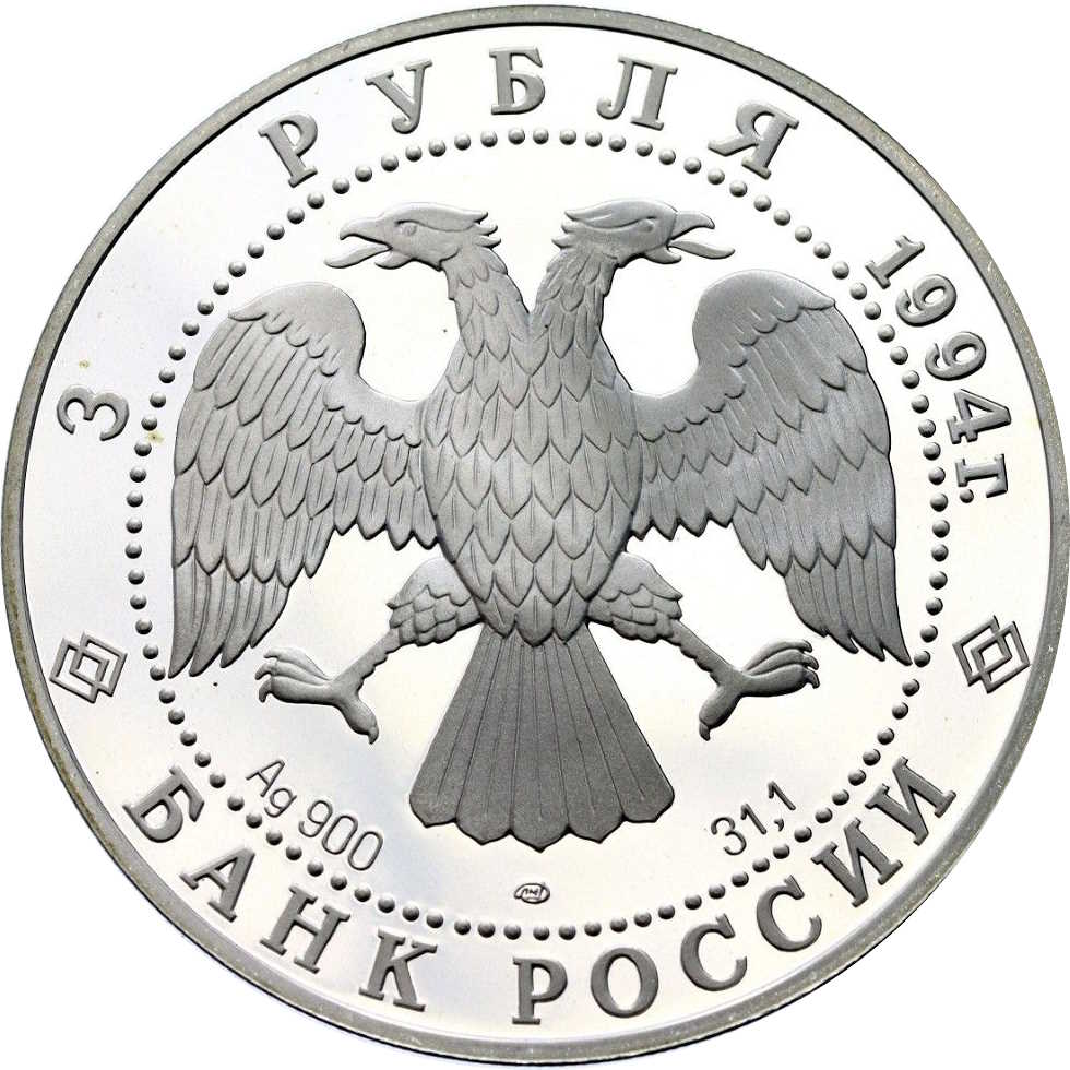 Описание: Двоголовий орел (дизайн І. Білібіна), літери під ним позначають метал, пробу, знак монетного двору та вміст дорогоцінного металу. Написи по краю: зверху — «3 РУБЛЯ 1994 г.» (3 РУБЛЯ 1994), знизу — «БАНК РОССИИ» (БАНК РОСІЇ).