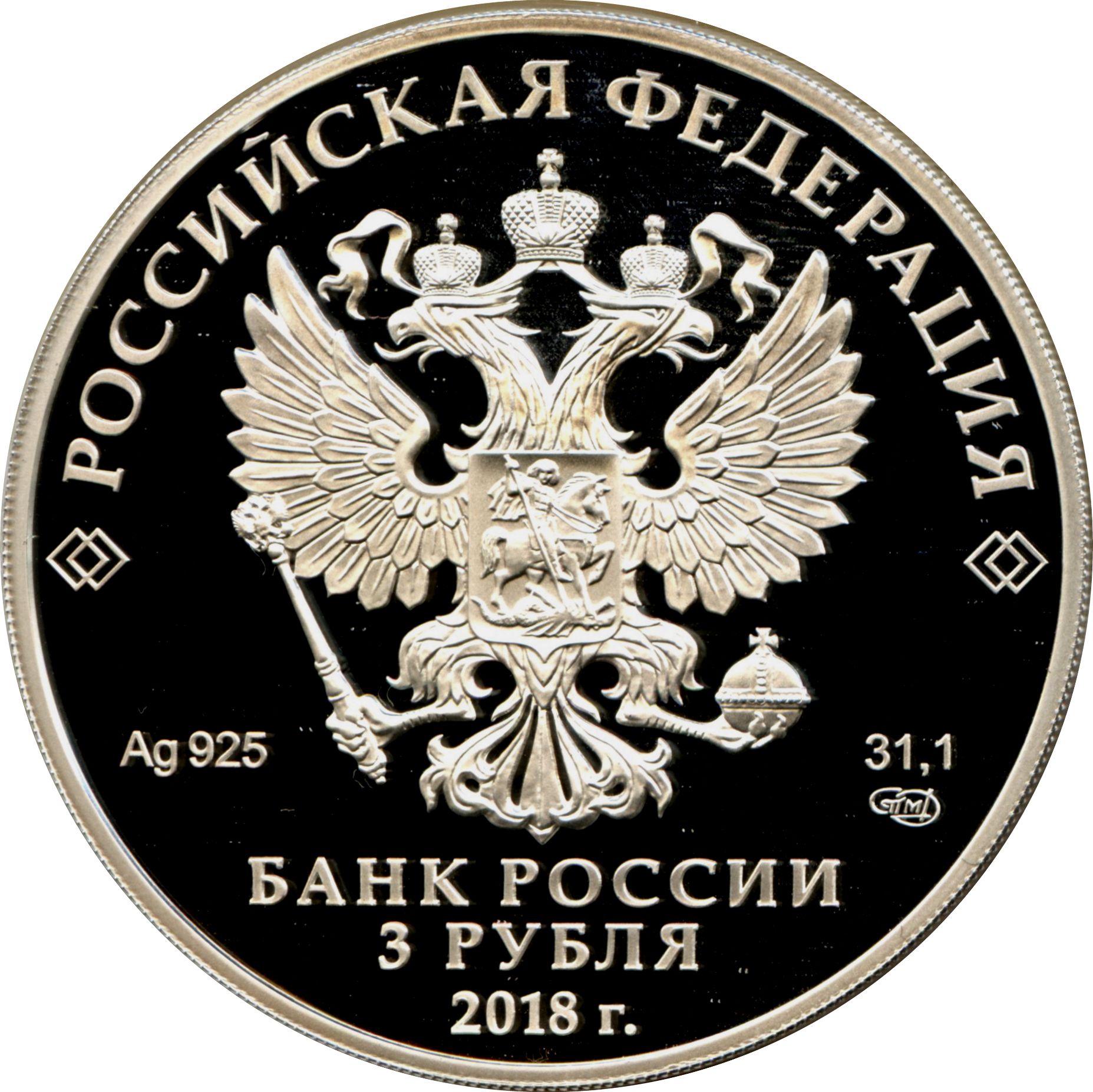 Описание: На дзеркальному полі диска — рельєфне зображення Державного герба Російської Федерації, над ним по колу — напівкруглий напис «РОССИЙСКАЯ ФЕДЕРАЦИЯ» (РОСІЙСЬКА ФЕДЕРАЦІЯ), обрамлений з обох боків подвійними ромбами, нижче під гербом ліворуч вказівки на дорогоцінний метал і його пробу, праворуч — вміст дорогоцінного металу і знак монетного двору, внизу по центру напис у три рядки «БАНК РОССИИ» (БАНК РОСІЇ), номінал монети «3 РУБЛЯ» (3 РУБЛІ), рік випуску «2018 г.» (2018).