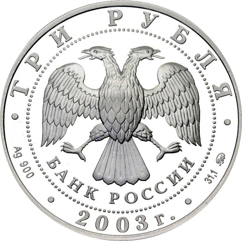Описание: У центрі — емблема Банку Росії [двоголовий орел із розпростертими крилами, нижче — напівкругла напис — «БАНК РОССИИ» (БАНК РОСІЇ)] в обрамленні кола з крапок і написів по краю: зверху — «ТРИ РУБЛЯ», внизу — рік випуску «2003», літери ліворуч позначають метал і пробу, праворуч — вміст дорогоцінного металу і знак монетного двору.