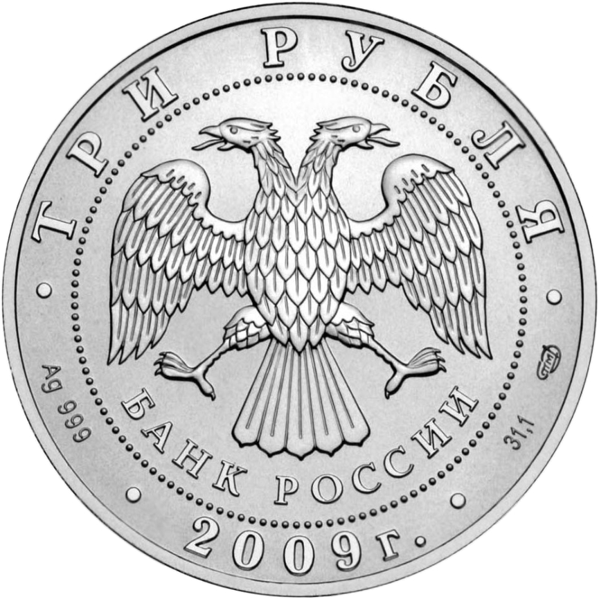 Описание: У центрі — емблема Банку Росії [двоголовий орел із опущеними крилами, під ним — напівкруглий напис «БАНК РОССИИ» (БАНК РОСІЇ)], обрамлена колом з крапок і написів по краю — зверху: «ТРИ РУБЛЯ», нижче: ліворуч - позначення дорогоцінного металу та його проби, в центрі - рік випуску «2009 г.», праворуч - вміст дорогоцінного металу та знак монетного двору.