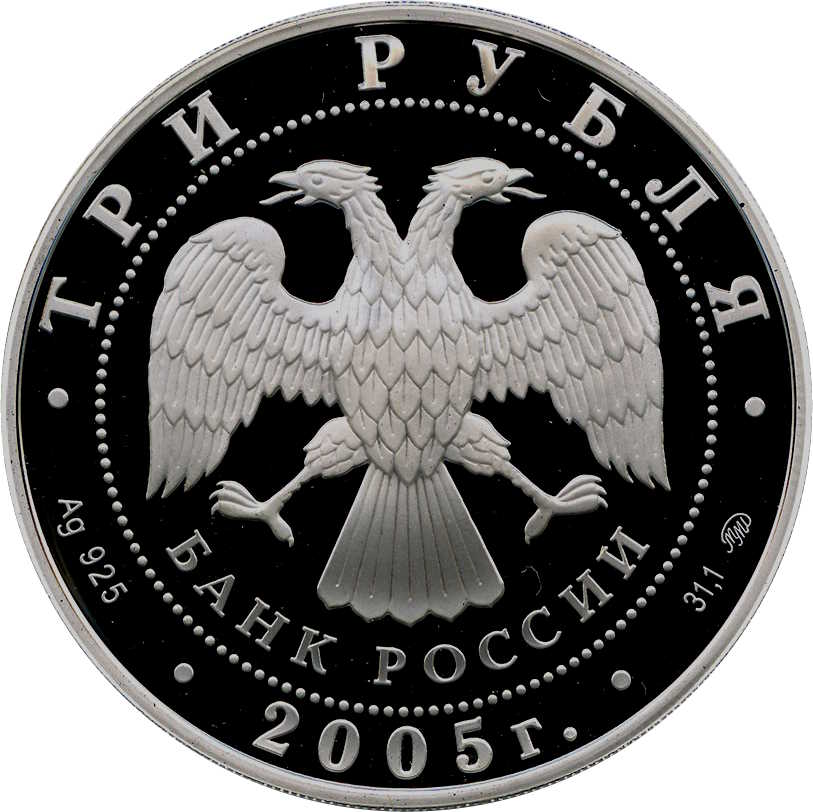 Описание: У центрі — емблема Банку Росії [двоголовий орел із опущеними крилами, нижче — напівкруглий напис — «БАНК РОССИИ» (БАНК РОСІЇ)], обрамлений колом з крапок і написами по краю: вгорі – «ТРИ РУБЛЯ» (ТРИ РУБЛІ), внизу – рік випуску «2005», літери ліворуч позначають метал і пробу, праворуч – вміст дорогоцінного металу і знак монетного двору.