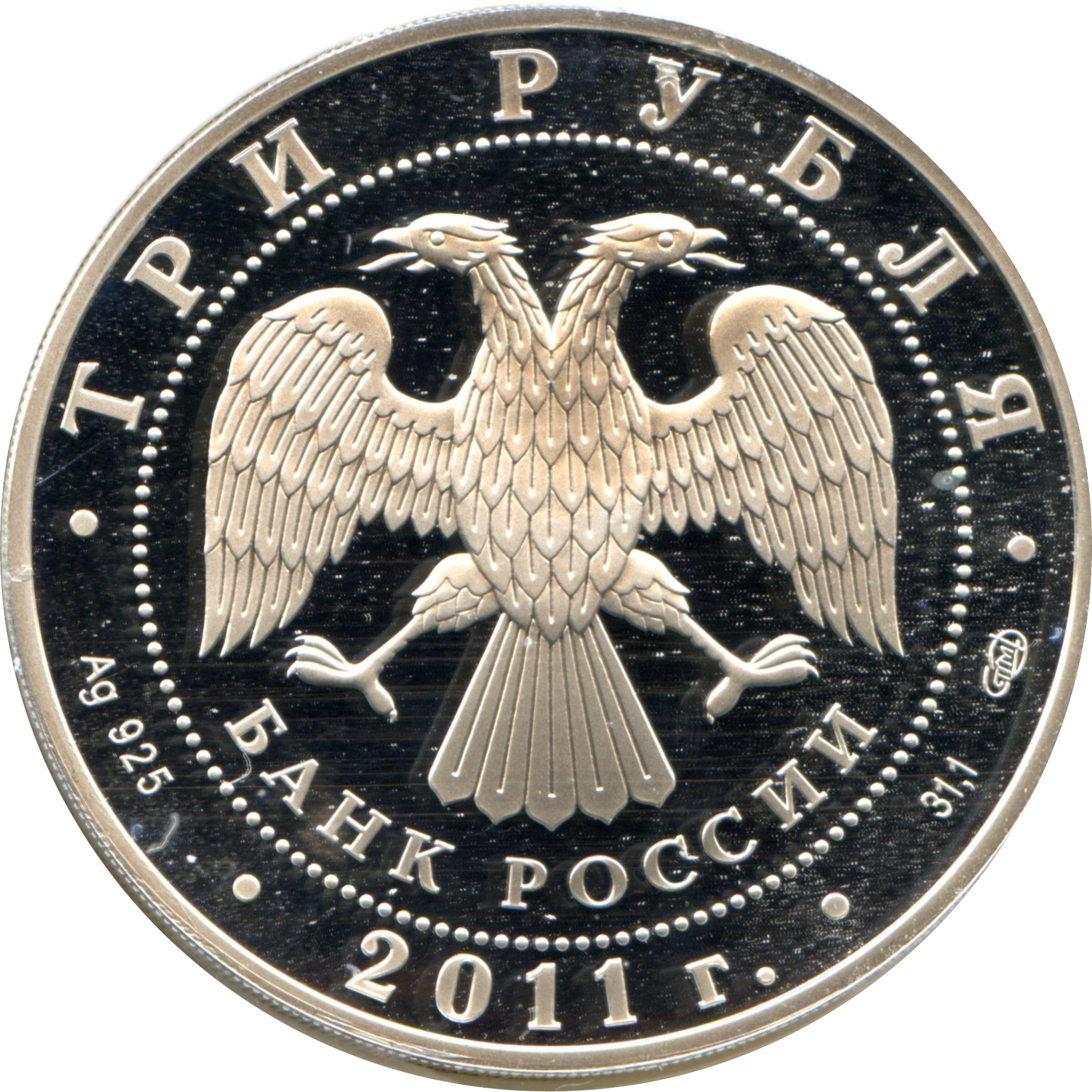 Описание: У центрі — емблема Банку Росії [двоголовий орел із опущеними крилами, під ним — напівкруглий напис «БАНК РОССИИ» (БАНК РОСІЇ)], обрамлена колом з крапок, а по краю — написи: зверху: «ТРИ РУБЛЯ», нижче: ліворуч - позначення дорогоцінного металу та його проби, у центрі - рік випуску «2011 г.», праворуч - вміст дорогоцінного металу та знак монетного двору.