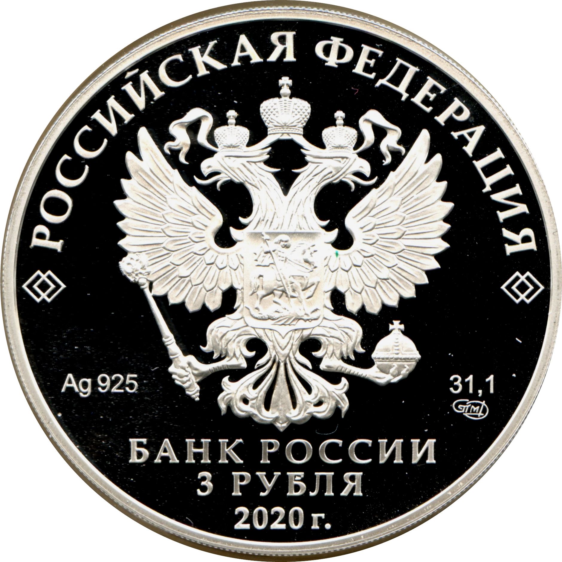 Описание: На дзеркальному полі диска зображено рельєфний герб Російської Федерації, над ним по колу розміщено напівкруглий напис «РОССИЙСКАЯ ФЕДЕРАЦИЯ» (РОСІЙСЬКА ФЕДЕРАЦІЯ), обрамлене з обох боків подвійними ромбами, нижче під гербом зліва вказано дорогоцінний метал і його пробу, а праворуч — вміст дорогоцінного металу і знак монетного двору, внизу по центру трьома рядками розміщено напис «БАНК РОССИИ» (БАНК РОСІЇ), номінал монети «3 РУБЛЯ» (3 РУБЛІ) і рік випуску «2020 г.» (2020).