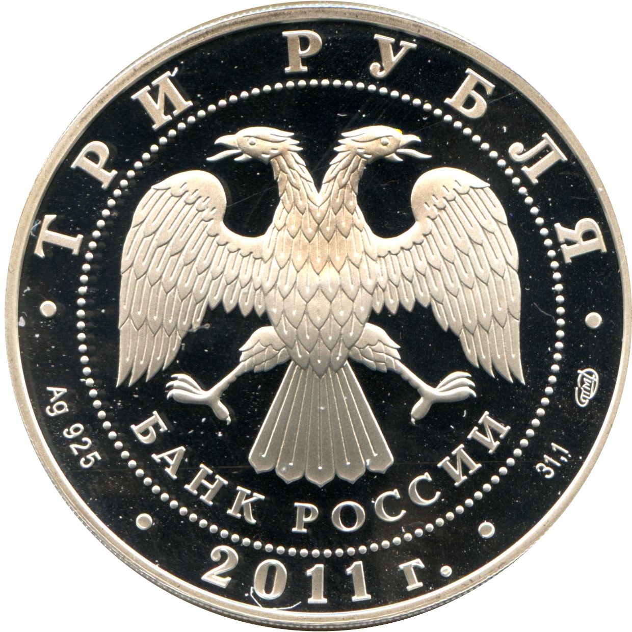 Описание: У центрі — емблема Банку Росії [двоголовий орел із опущеними крилами, під ним — напівкруглий напис «БАНК РОССИИ» (БАНК РОСІЇ)], обрамлена колом з крапок, а по краю — написи: зверху: «ТРИ РУБЛЯ», нижче: ліворуч - позначення дорогоцінного металу та його проби, в центрі - рік випуску «2011 г.», праворуч - вміст дорогоцінного металу та знак монетного двору.