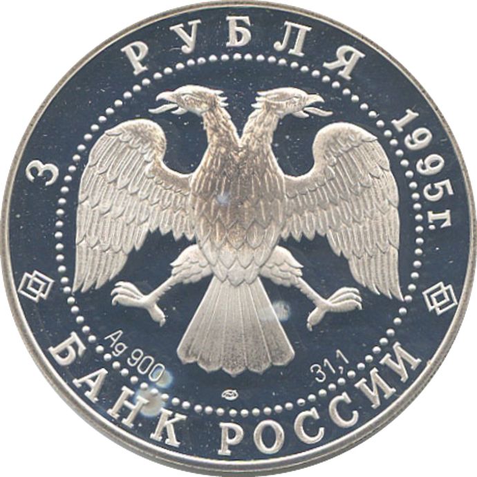 Описание: У центрі — емблема Банку Росії (двоголовий орел, створений І. Білібіним), під нею літери, що позначають метал, пробу, знак монетного двору та вміст дорогоцінного металу. Написи по краю, обрамлені колом з крапок: зверху — «3 РУБЛЯ 1995 г.» (3 РУБЛЯ 1995), знизу — «БАНК РОССИИ» (БАНК РОСІЇ).