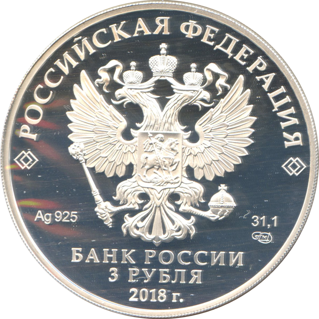 Описание: На дзеркальному полі диска – рельєфне зображення Державного герба Російської Федерації, над ним – напівкругла напис по колу: «РОССИЙСКАЯ ФЕДЕРАЦИЯ» (РОСІЙСЬКА ФЕДЕРАЦІЯ), обрамлене з обох боків подвійними ромбами, нижче під гербом: ліворуч – позначення дорогоцінного металу та його проби, праворуч – вміст дорогоцінного металу та торговельна марка монетного двору, внизу по центру, у три рядки – напис: «БАНК РОССИИ» (БАНК РОСІЇ), номінал монети: «3 РУБЛЯ» (3 РУБЛІ), рік.