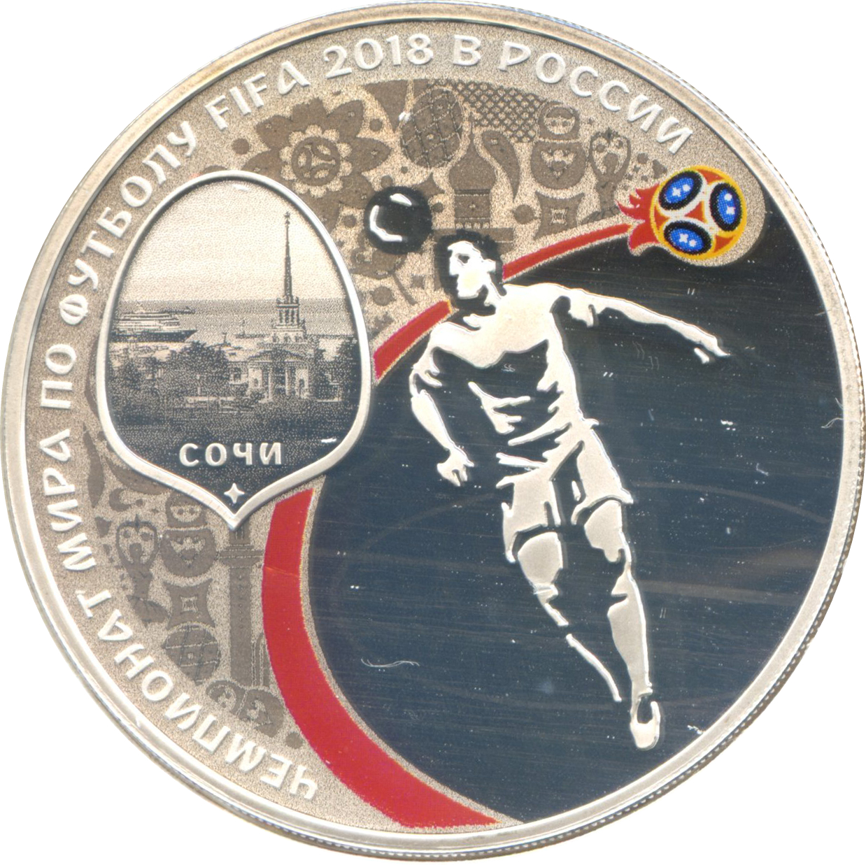 Описание: Зображення картуша з морським портом Сочі та написом «Сочі» на тлі, що поєднує два типи натхнення: культурну та фольклорну спадщину Росії та візуальний світ футболу; кольоровий слід від літаючого м'яча; футболіст. По периметру зліва розміщений напис — «ЧЕМПИОНАТ МИРА ПО ФУТБОЛУ FIFA 2018 В РОССИИ» (ЧЕМПІОНАТ СВІТУ З ФУТБОЛУ FIFA 2018 У РОСІЇ).
