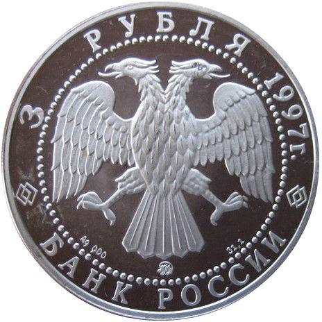 Описание: Двоголовий орел, створений художником І. Білібіним. Написи по краю: зверху — «3 РУБЛЯ 1997 г.» (3 РУБЛЯ 1997), знизу — «БАНК РОССИИ» (БАНК РОСІЇ). Літери нижче позначають метал, пробу, вміст дорогоцінного металу та знак монетного двору.