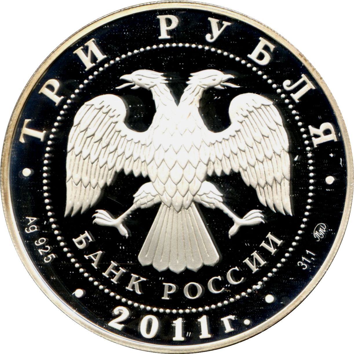 Описание: У центрі — емблема Банку Росії [двоголовий орел із розпростертими крилами, під ним — напівкруглий напис «БАНК РОССИИ» (БАНК РОСІЇ)], обрамлена колом з крапок і написів по краю — зверху: «ТРИ РУБЛЯ», нижче: ліворуч - позначення дорогоцінного металу та його проби, в центрі - рік випуску «2011 г.», праворуч - вміст дорогоцінного металу та знак монетного двору.