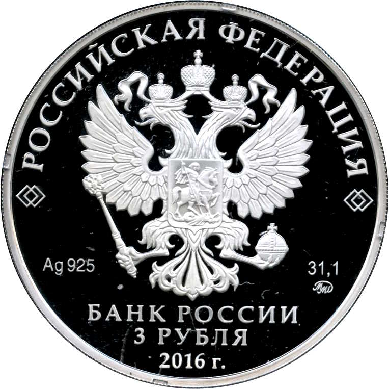 Описание: На дзеркальному полі диска – рельєфне зображення Державного герба Російської Федерації, над ним – напівкругла напис по колу: «РОССИЙСКАЯ ФЕДЕРАЦИЯ» (РОСІЙСЬКА ФЕДЕРАЦІЯ), обрамлене з обох боків подвійними ромбами, нижче під гербом: ліворуч – позначення дорогоцінного металу та його проби, праворуч – вміст дорогоцінного металу та торговельна марка монетного двору, внизу по центру, у три рядки – напис: «БАНК РОССИИ» (БАНК РОСІЇ), номінал монети: «3 РУБЛЯ» (3 РУБЛІ), рік випуску: «2016 г.» (2016).