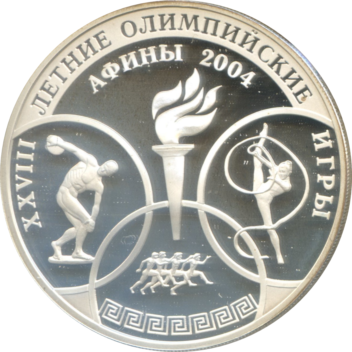 Описание: У центрі — олімпійський факел, над ним напис — «АФИНЫ 2004» (АТЕНИ 2004), фігури в обмежених кільцях: ліворуч — статуя «Дискоболець», праворуч — гімнастка з стрічкою, внизу — стилізоване зображення давньогрецьких бігунів з грецьким орнаментом під ними. Напис у верхній частині по краю: «XXVIII ЛЕТНИЕ ОЛИМПИЙСКИЕ ИГРЫ» (XXVIII ЛІТНІ ОЛІМПІЙСЬКІ ІГРИ).