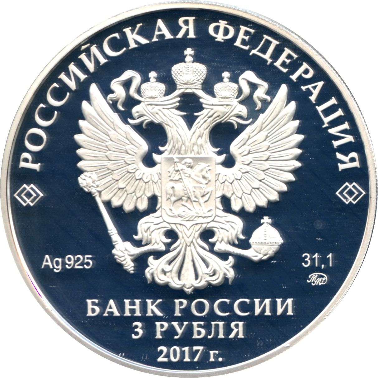 Описание: На дзеркальному полі диска – рельєфне зображення Державного герба Російської Федерації, над ним – напівкругла напис по колу: «РОССИЙСКАЯ ФЕДЕРАЦИЯ» (РОСІЙСЬКА ФЕДЕРАЦІЯ), обрамлений з обох боків подвійними ромбами, нижче під гербом: ліворуч – позначення дорогоцінного металу та його проби, праворуч – вміст дорогоцінного металу та знак монетного двору, внизу по центру, у три рядки – напис: «БАНК РОССИИ» (БАНК РОСІЇ), номінал монети: «3 РУБЛЯ» (3 РУБЛІ), рік.