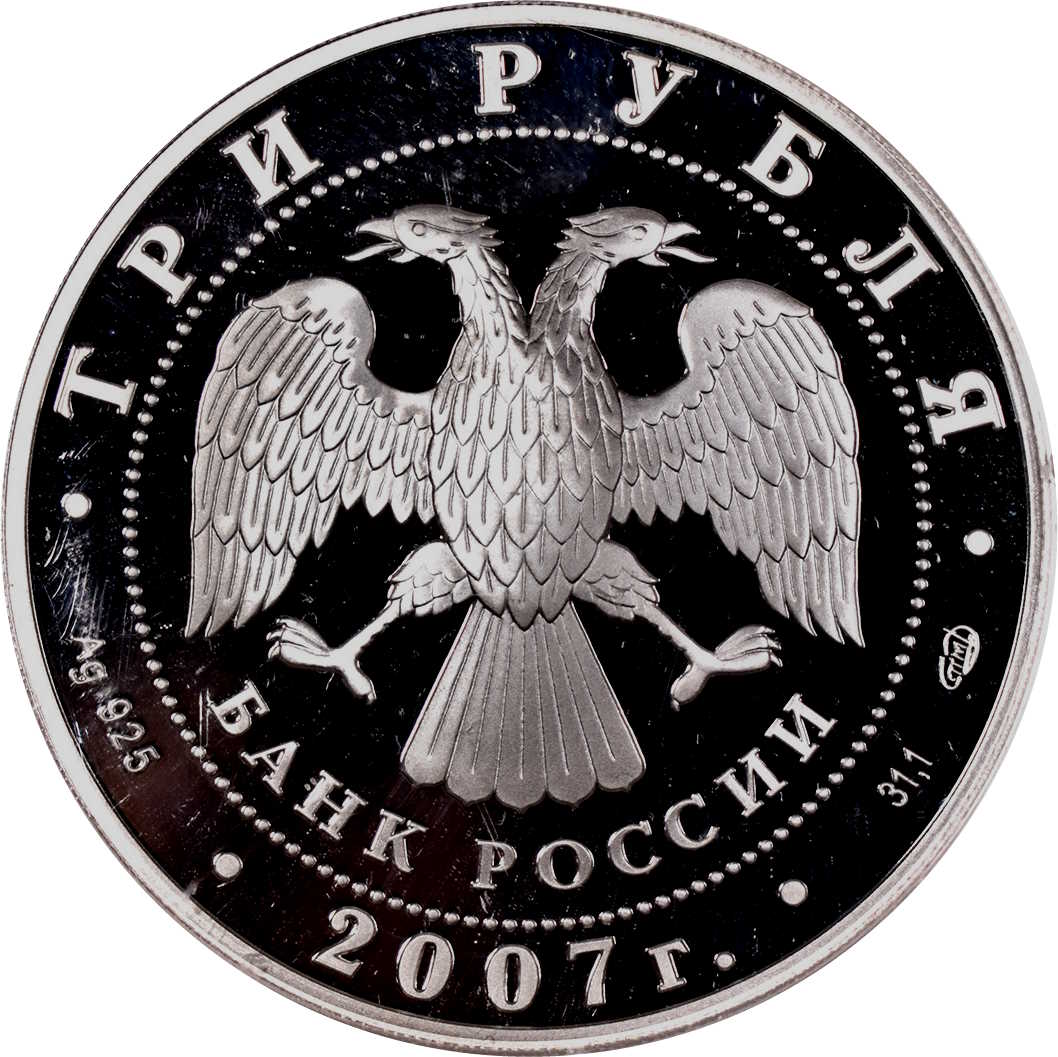 Описание: У центрі — емблема Банку Росії [двоголовий орел із опущеними крилами, під ним — напівкруглий напис «БАНК РОССИИ» (БАНК РОСІЇ)], обрамлена колом з крапок і написів по краю — зверху: «ТРИ РУБЛЯ» (ТРИ РУБЛІ), внизу: ліворуч – позначення дорогоцінного металу та його проби, в центрі – рік випуску «2007 г.» (2007), праворуч – вміст дорогоцінного металу та знак монетного двору.