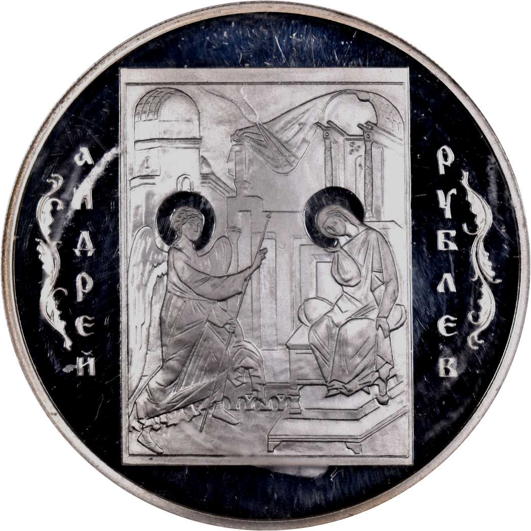 Описание: У центрі — зображення ікони «Благовіщення», праворуч і ліворуч від нього — вертикальні написи «Андрей» і «Рублев» та стилізований рослинний орнамент.