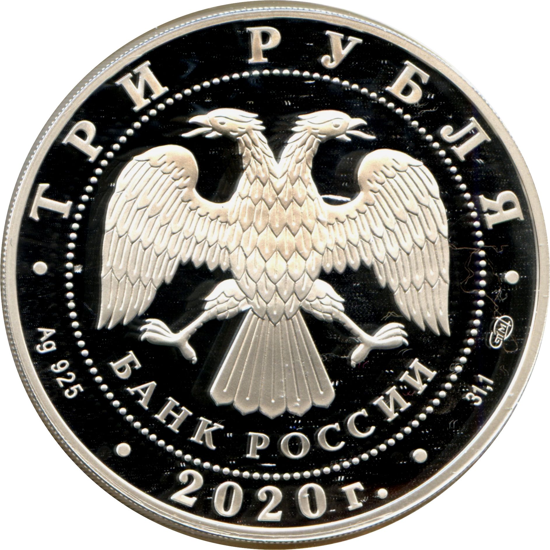 Описание: На дзеркальному полі диска зображено рельєфне зображення емблеми Банку Росії — двоголового орла з опущеними крилами — в кільці у формі намистини та напівкруглий напис «БАНК РОССИИ» (БАНК РОСІЇ) під ним; по краю розміщені написи, розділені крапками: номінал монети «3 РУБЛЯ» (3 РУБЛЯ), внизу – рік випуску «2020 г.» (2020), а посередині – позначення дорогоцінного металу, проби, знак монетного двору та вміст дорогоцінного металу.