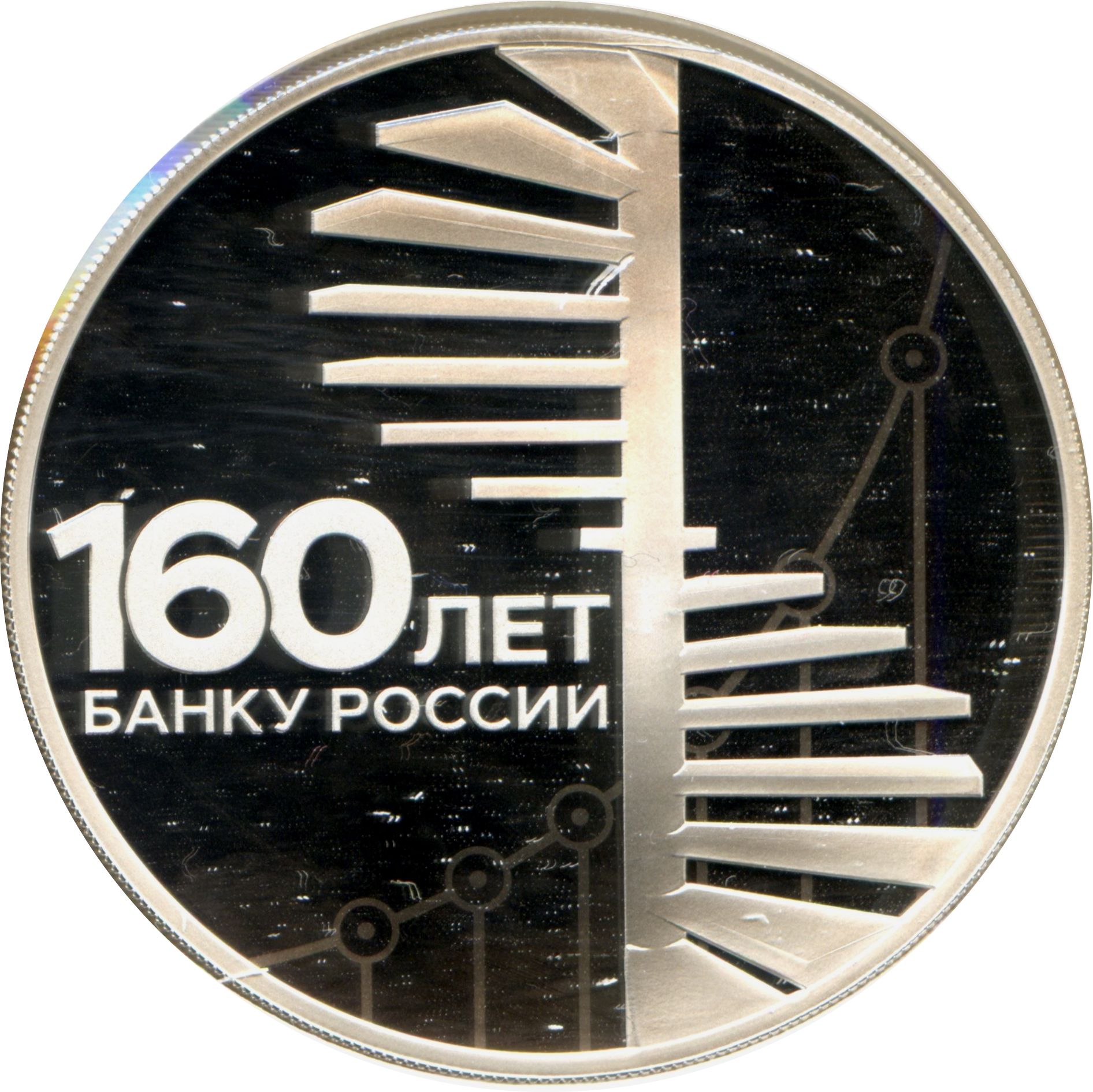 Описание: На дзеркальному полі диска зображено стилізоване зображення сходів, що піднімаються спіраллю і символізують розвиток, на тлі діаграми зростання; зліва дворядковий напис: «160 ЛЕТ БАНКУ РОССИИ» (160 РОКІВ БАНКУ РОСІЇ).