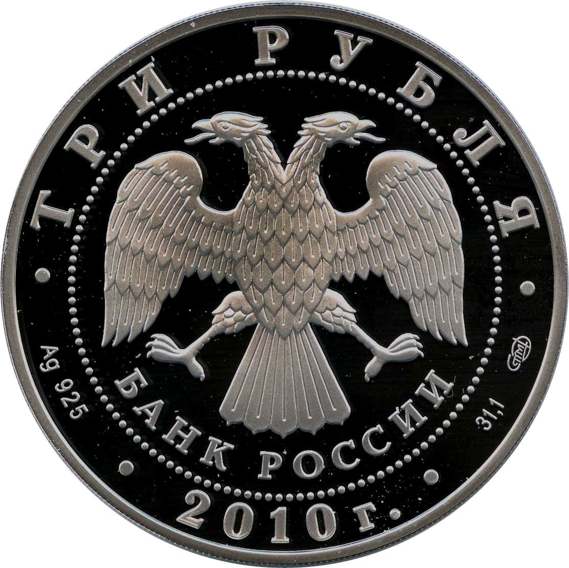 Описание: У центрі — емблема Банку Росії [двоголовий орел зі спущеними крилами, під ним — напівкруглий напис «БАНК РОССИИ» (БАНК РОСІЇ)], обрамлена колом з крапок і написів по краю — зверху: «ТРИ РУБЛЯ», нижче: ліворуч - позначення дорогоцінного металу та його проби, у центрі - рік випуску «2010 г.», праворуч - вміст дорогоцінного металу та знак монетного двору.