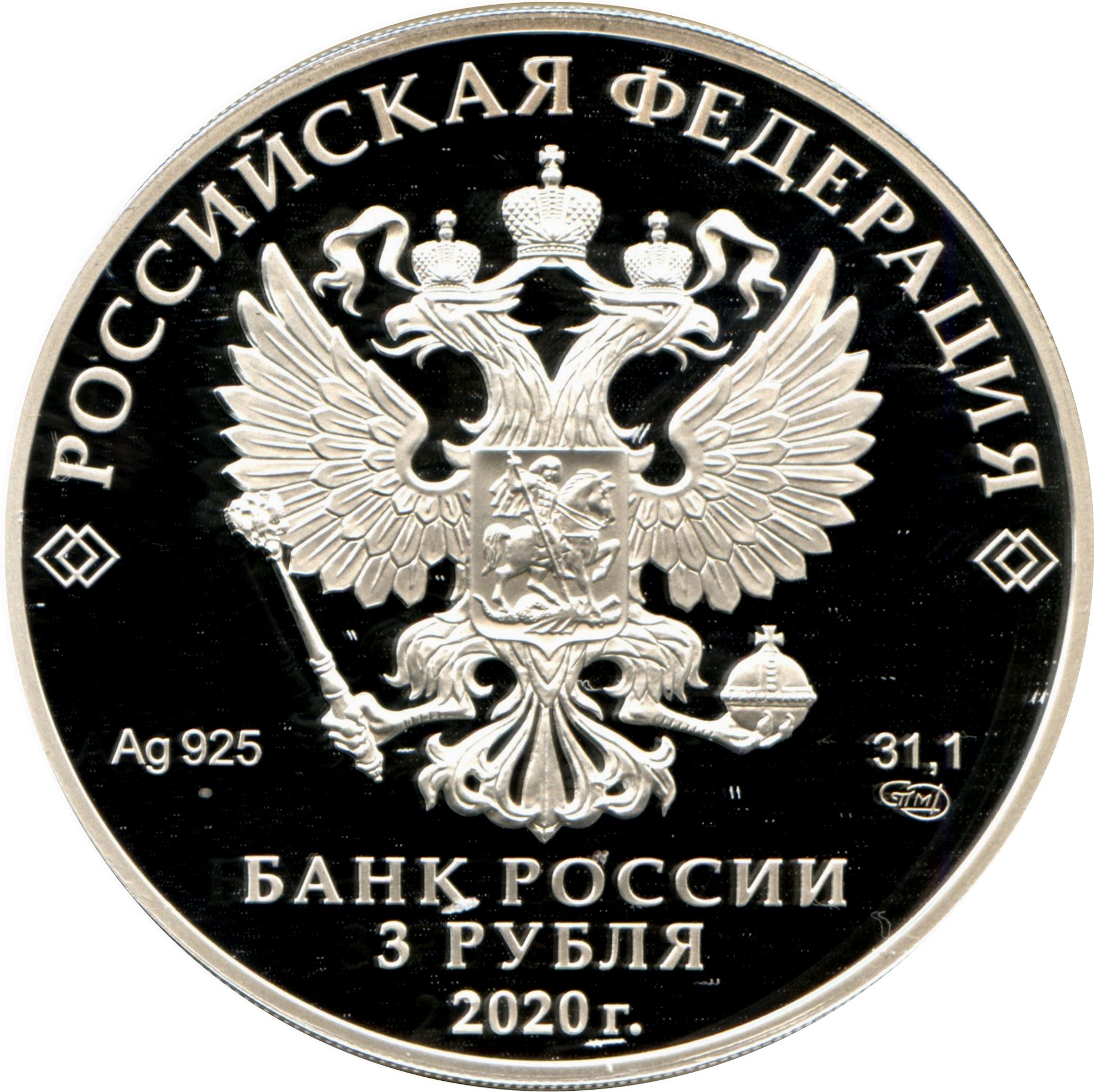 Описание: На дзеркальному полі диска зображено рельєфний герб Російської Федерації, над ним по колу розміщено напівкруглий напис «РОССИЙСКАЯ ФЕДЕРАЦИЯ» (РОСІЙСЬКА ФЕДЕРАЦІЯ), обрамлене з обох боків подвійними ромбами, нижче під гербом зліва вказано дорогоцінний метал і його пробу, а праворуч — вміст дорогоцінного металу і знак монетного двору, внизу по центру трьома рядками розміщено напис «БАНК РОССИИ» (БАНК РОСІЇ), номінал монети «3 РУБЛЯ» (3 РУБЛІ) і рік випуску «2020 г.» (2020).