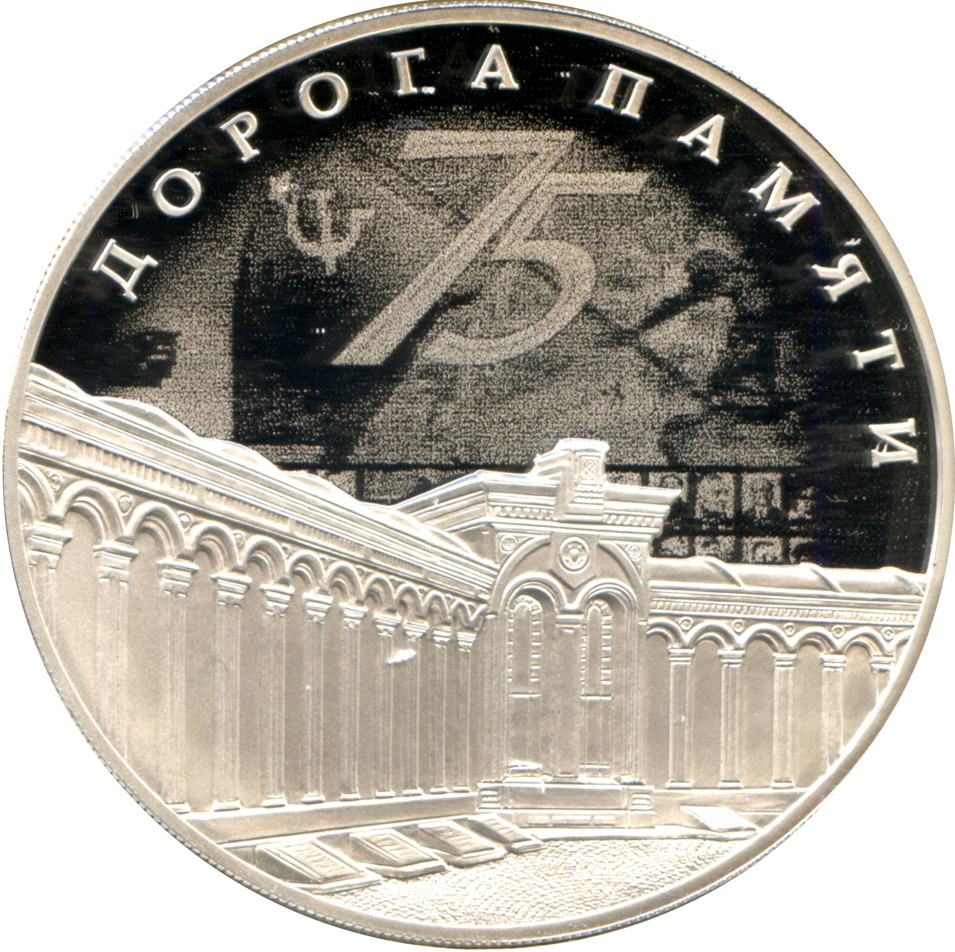 Описание: Рельєфне зображення меморіалу «Дорога пам'яті», цифра «75» над ним та напис «ДОРОГА ПАМ'ЯТИ» (THE ROAD OF MEMORY) у верхній частині вздовж краю.