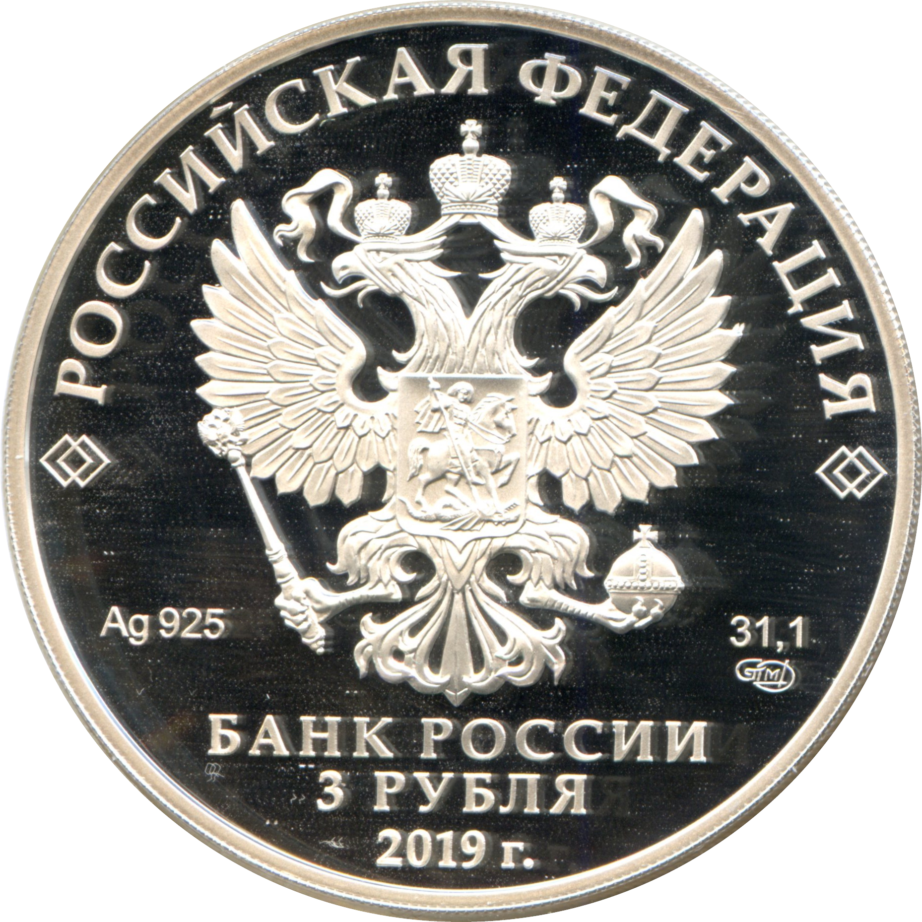Описание: На дзеркальному полі диска – рельєфне зображення Державного герба Російської Федерації, над ним – напівкругла напис по колу: «РОССИЙСКАЯ ФЕДЕРАЦИЯ» (РОСІЙСЬКА ФЕДЕРАЦІЯ), обрамлена з обох боків подвійними ромбами, нижче під гербом: ліворуч – позначення дорогоцінного металу та його проби, праворуч – вміст дорогоцінного металу та знак монетного двору, внизу по центру, у три рядки – напис: «БАНК РОССИИ» (БАНК РОСІЇ), номінал монети: «3 РУБЛЯ» (3 РУБЛІ), рік.