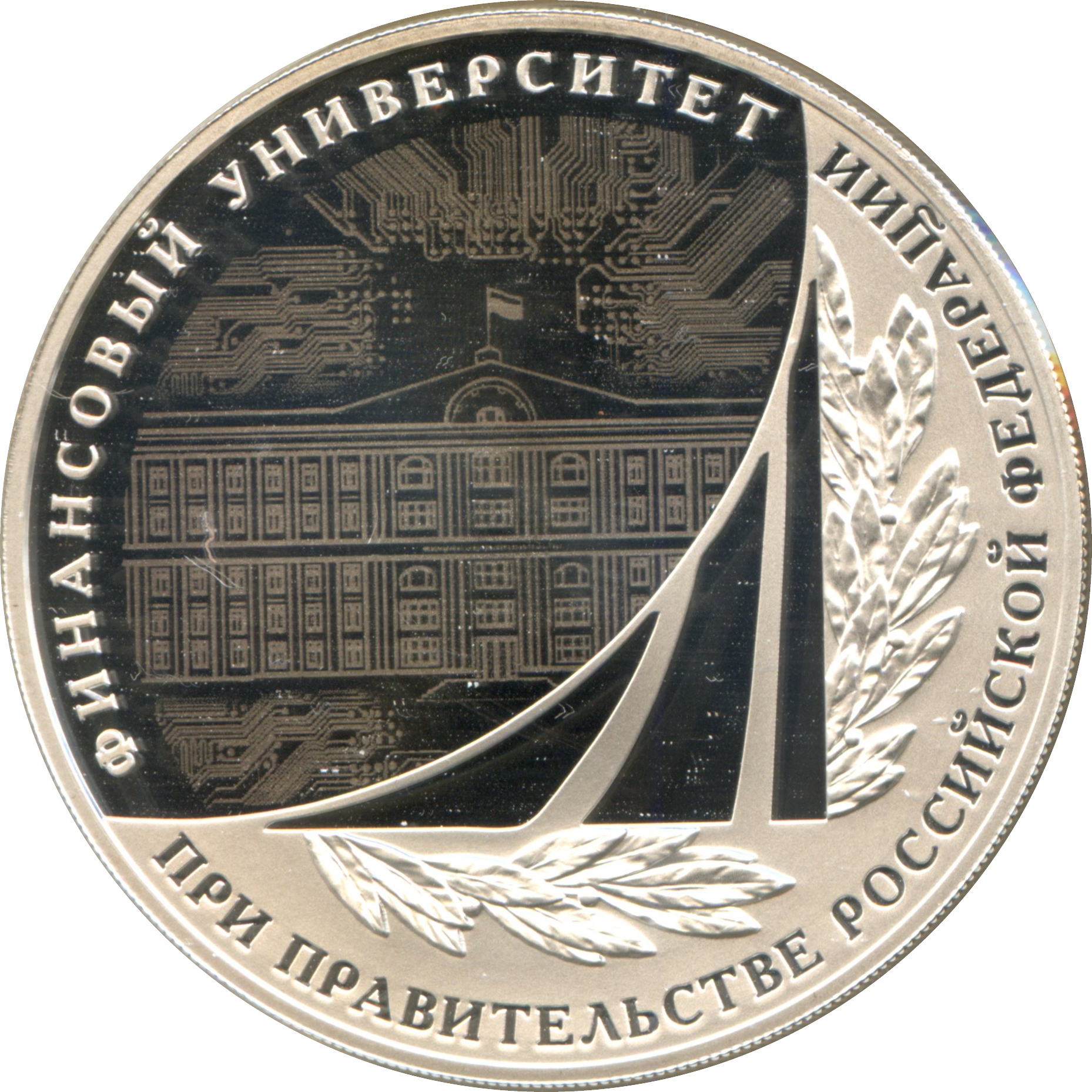 Описание: Стилізовані зображення будівлі Фінансового університету при Уряді Російської Федерації та друкованої плати, обробленої лазером для матового покриття, а також емблема університету та рельєфне зображення лаврового листя; є напівкругла напис: «ФИНАНСОВЫЙ УНИВЕРСИТЕТ ПРИ ПРАВИТЕЛЬСТВЕ РОССИЙСКОЙ ФЕДЕРАЦИИ» (ФІНАНСОВИЙ УНІВЕРСИТЕТ ПРИ УРЯДІ РОСІЙСЬКОЇ ФЕДЕРАЦІЇ).